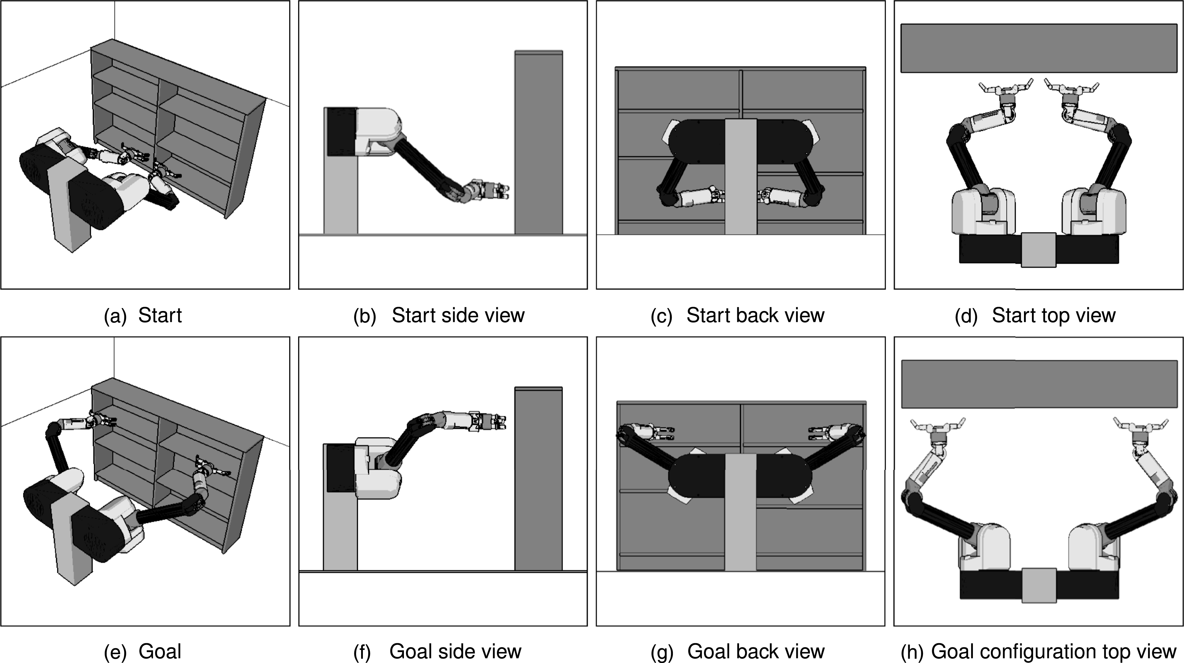 In the dual-arm planning experiment, the algorithms were instructed to find paths for two Barret WAM arms with a total of 14 degrees of freedom from a start configuration at the bottom shelf to a goal configuration at the top shelf (Figure 9). Illustrations of the dual-arm manipulator problem. The top row shows the start configuration of the arms in position to pick up two objects on the bottom shelf (a–d). The bottom row shows the goal configuration of the arms in position to place these objects on the top shelf (e–h).