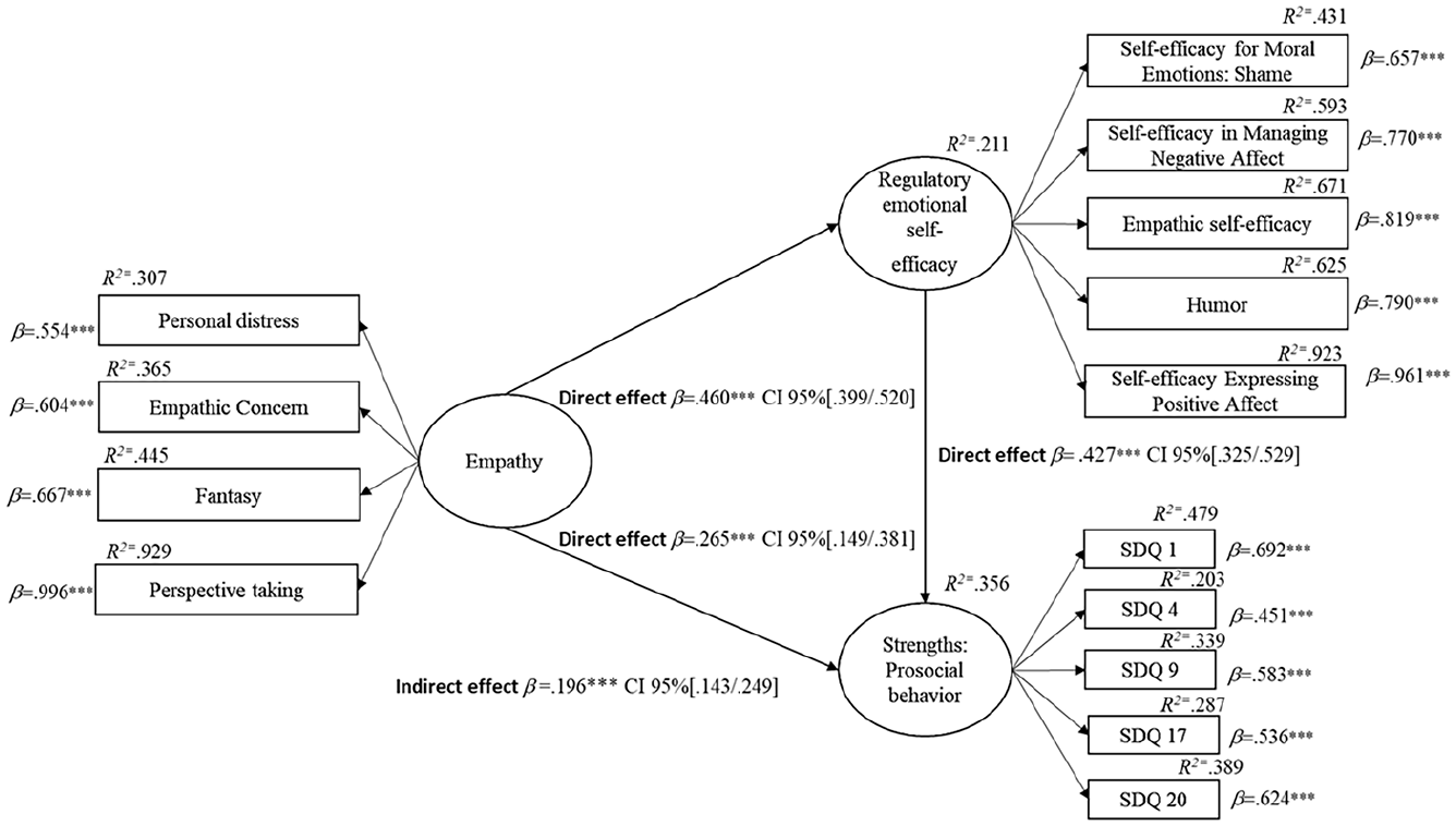 Figure 2 shows the structural model of prosocial strengths, which is reflected in the items that define it. Empathy was found to have a positive and significant effect on regulatory emotional self-efficacy (