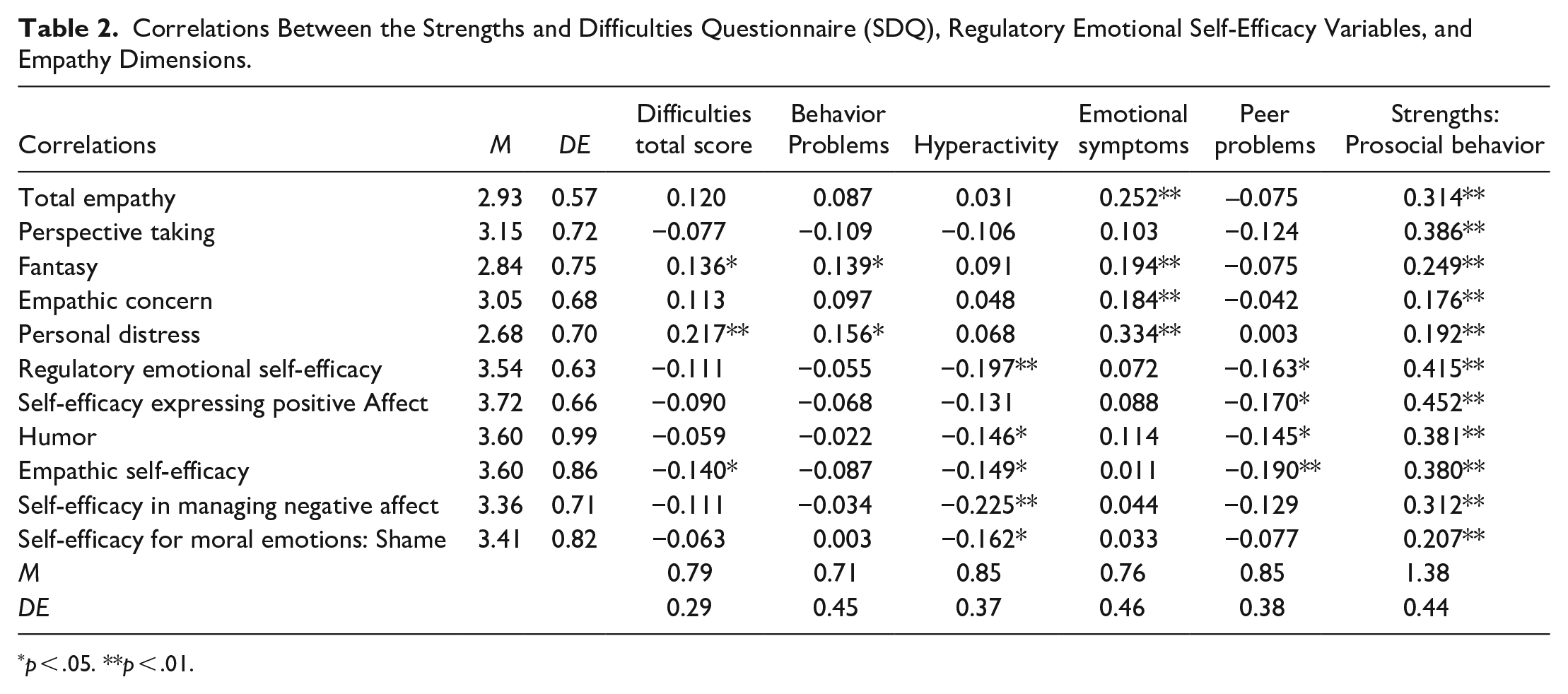 The correlation between internalizing emotional symptoms and total empathy, fantasy, empathic concern, and personal distress was direct and significant. In contrast, peer problems exhibited significant inverse correlations with regulatory emotional self-efficacy (total score), self-efficacy for expressing positive affect, humor, and empathic self-efficacy. Finally, the prosocial strengths dimension exhibited a direct and significant correlation with all variables of regulatory emotional self-efficacy and empathy.