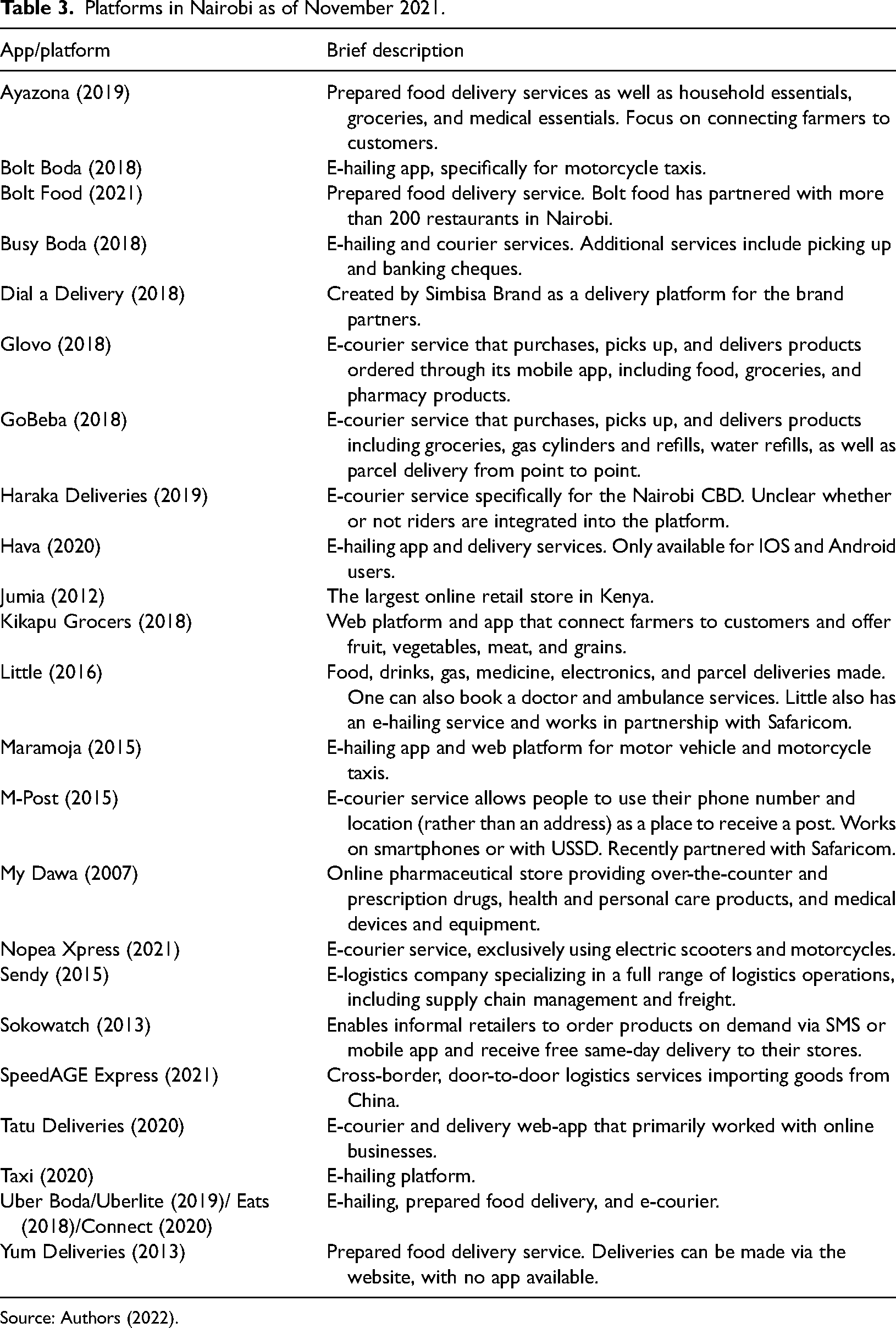 From Tables 2 and 3, two trends are evident. First, there has been a rapid rise in platforms in the past 4 years. These not only map onto the COVID-19 pandemic, but also prefigured it. As several interviewees noted, many were thinking in this space before COVID—but it was the pandemic that helped them make the case to funders of the need and potential of platform services. Second, Tables 2 and 3 show incredible diversity of offering and specialization. Platforms specialize in the kind of service they offer, and, if they are in the delivery business, in the kind of commodities that they move. Platforms range from e-hailing, whereby users access on-demand pillion services for commuting, to deliveries, such as groceries and medicines. There are also platforms that have a multi-tiered offering; this is usually the case with larger players, such as Uber and Bolt. In this sense, there has not only been a rise in platforms, but also a diversification of their offerings.