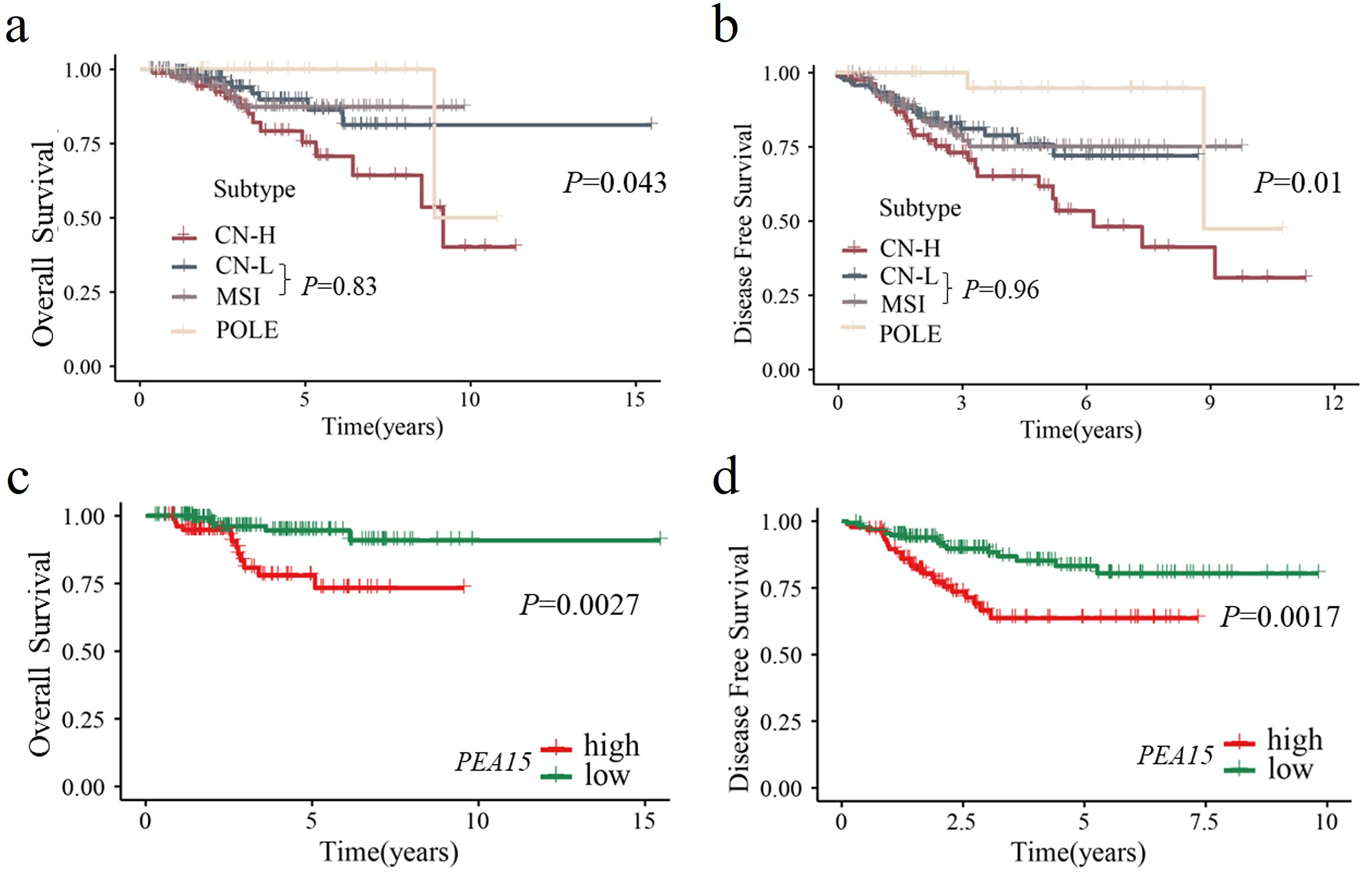 Kaplan–Meier curves of TCGA molecular classification and its correlation with PEA15. (a) Kaplan-Meier curves showing OS for early-stage endometrial cancer patients stratified by TCGA molecular classification: POLE, MSI, CN-L, and CN-H. (b) Kaplan–Meier curves showing the DFS of early-stage endometrial cancer patients stratified by TCGA molecular classification. (c) Kaplan–Meier curves showing OS for groups with high and low expression levels of