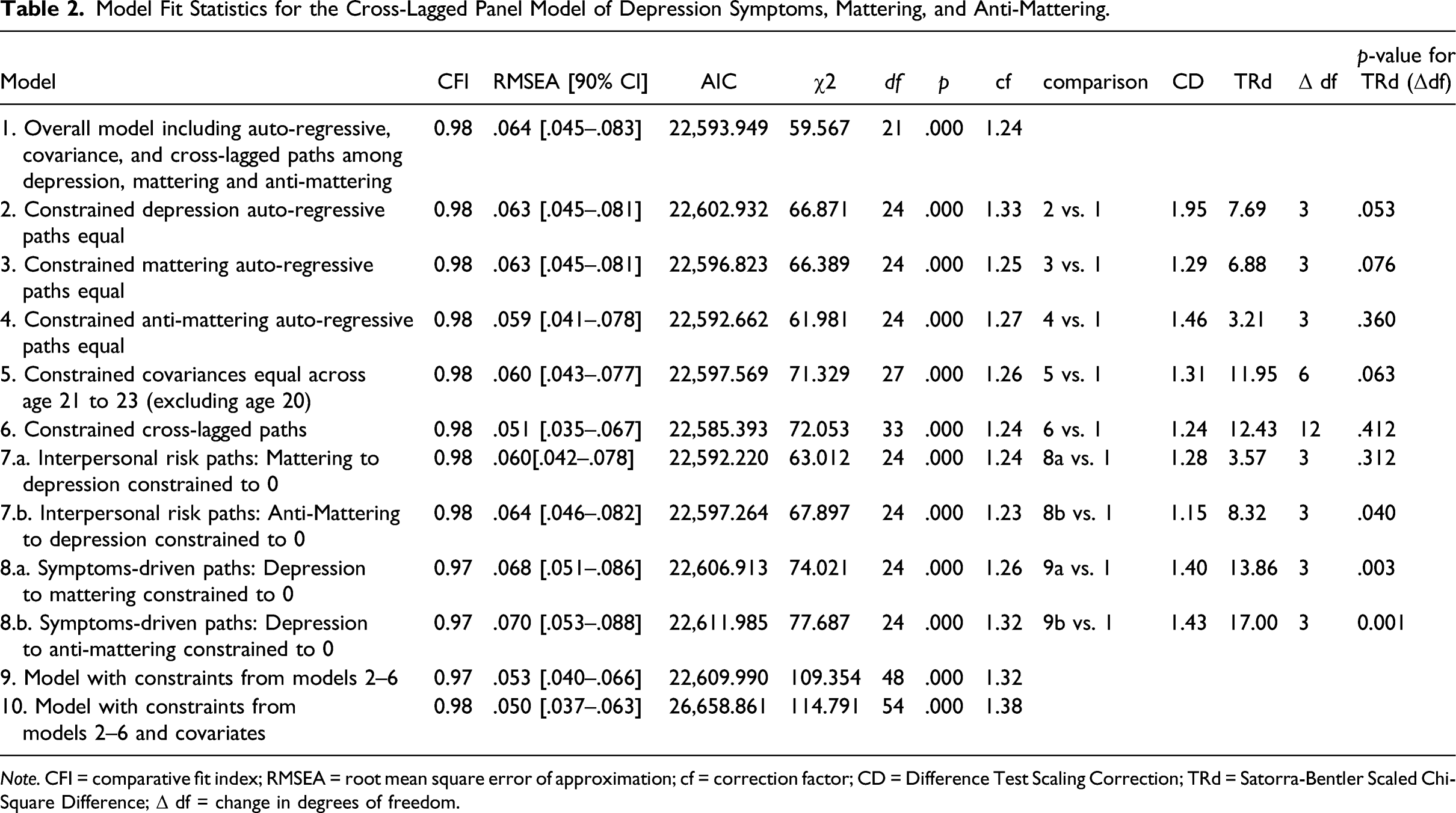 Invariance of similar paths across time was examined to determine if the unstandardized paths could be constrained to be equal across time or should be freely estimated. We found that similar auto-regressive paths for depression symptoms, mattering, and anti-mattering could each be constrained to be equal across time (Models 2–4). We constrained auto-regressive paths of depression symptoms to be equal and this did not have an impact on the model. Nor did constraining mattering auto-regressive paths equal or constraining anti-mattering paths equal impact the overall model. Residual covariances within-time were constrained to be equal across ages 21, 22, and 23 each for depression symptoms, mattering, and anti-mattering (Model 5) and this was not found to impact the overall model. Finally, similar cross-lagged paths were constrained to be equal across time each for depression to mattering, depression to anti-mattering, mattering to depression, anti-mattering to depression, mattering to anti-mattering, and anti-mattering to mattering (Model 6). This did not have an impact on the overall model fit. Next, cross-lagged paths related to interpersonal risk paths (i.e., mattering to depression [Model 7a] and anti-mattering to depression [Model 7b]) were constrained to 0 and this was compared to Model 1. Model 7a did not result in a deterioration of fit. Model 7b resulted in deterioration of fit indicating that the interpersonal risk paths were making a significant contribution to the model for anti-mattering but not mattering. In Model 8a and Model 8b, the symptoms-driven paths were constrained to 0 and compared to the constrained model which resulted in a deterioration of fit indicating the symptoms-driven paths were also making a significant contribution to the model. Although the mattering to depression paths were not contributing to the model statistically, we retained them in the model due to being theoretically relevant. Thus, a constrained model (Model 9) was built with the above constraints imposed on Models 2 through 6.