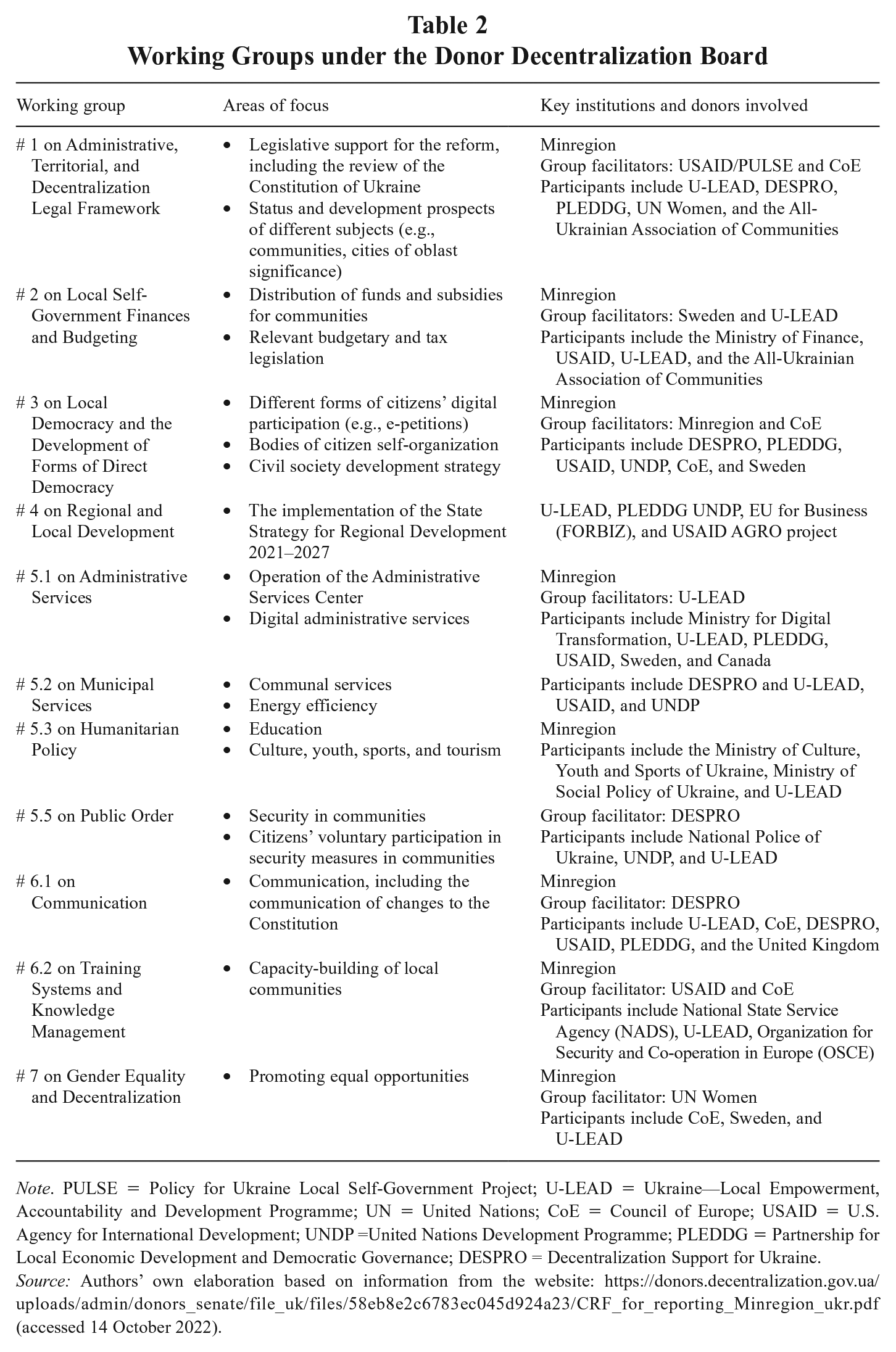 Neither Minsk I nor Minsk II turned donors’ support for decentralization as a governance reform into the promotion of decentralization as a TSG solution, as indicated by the structure of the Donor Board on Decentralization in Ukraine (Donor Decentralization Board), its declared objectives, and its project scope (see Table 1). This board, launched in 2017, serves as a platform for coordination between the Ministry of Communities and Territories Development of Ukraine (“Minregion”), foreign diplomatic missions, and the relevant donor agencies. The board consists of a secretariat and six working groups, whose key areas of focus are presented in Table 2.