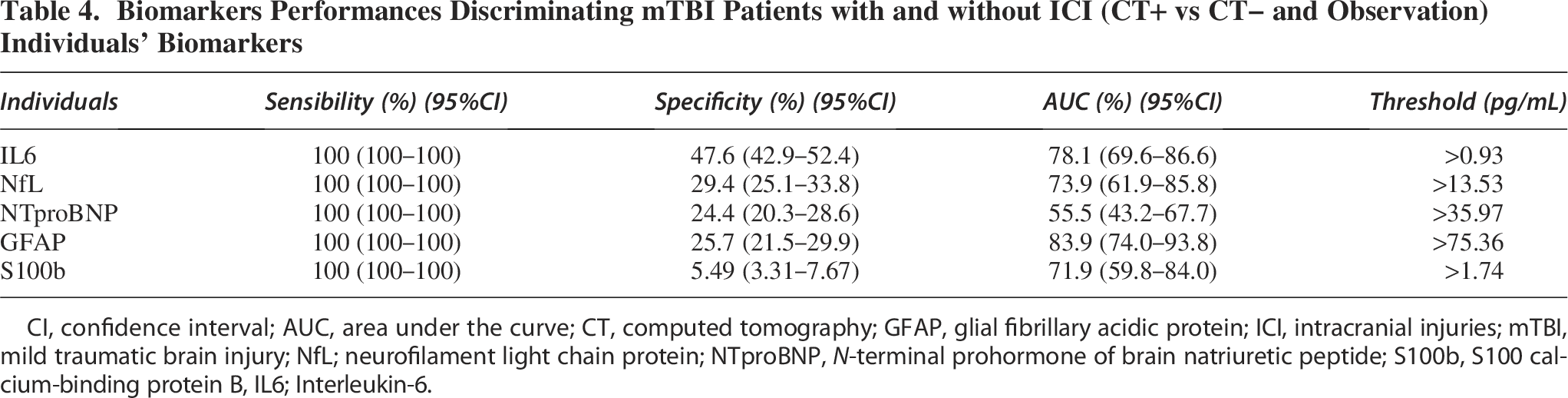 Based on these results, this study aimed to explore a selection of blood biomarkers in combination to enhance diagnostic accuracy in safely ruling out children without ICI after mTBI.
