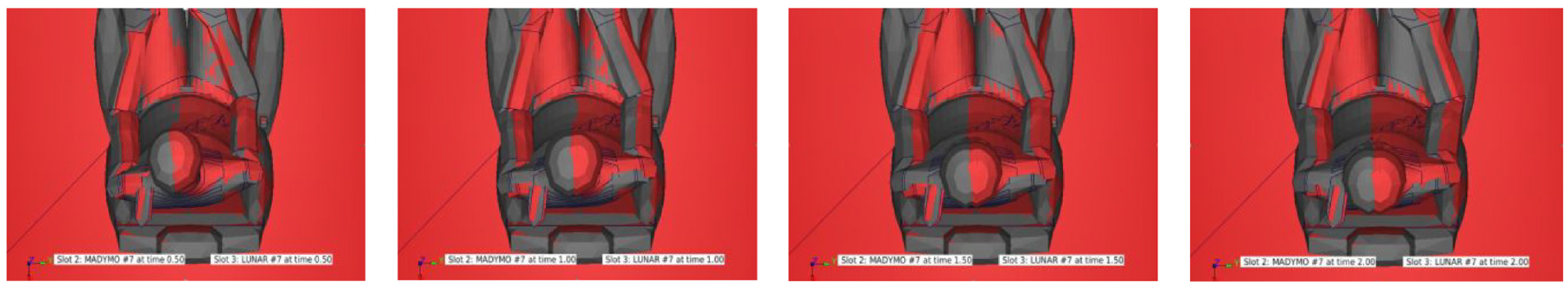 Kinematics overlay between ML predictions (red) and Madymo (dark grey) for Case 7. Left to Right: 0.5, 1.0, 1.5 and 2.0 s.