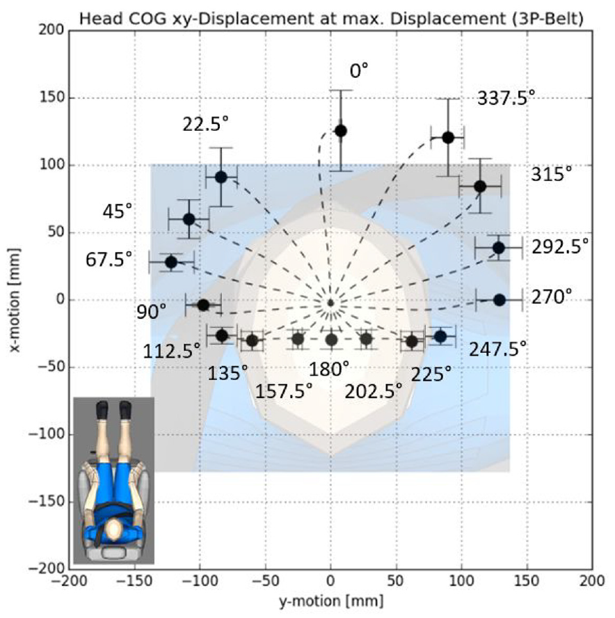 This section applies the derived and validated ML model to derive the total pre-crash head kinematics envelope for a 20° SBA scenario. For this purpose, the ML model has been asked to calculate the kinematics response for 500 AAs, evenly distributed in the domain 0°−360°.