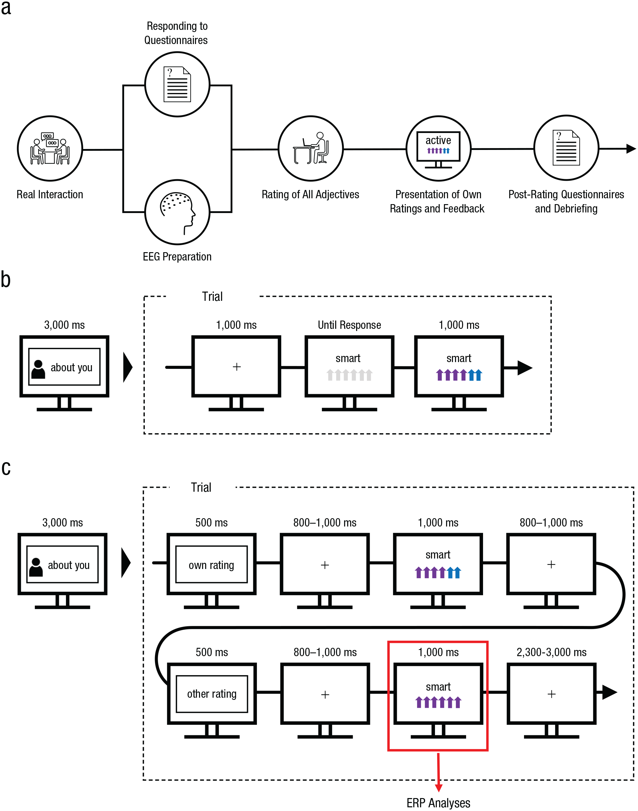 Experimental design (a) and trial sequence (b and c). The complete timeline of the experiment is shown in (a). Electroencephalograms (EEGs) were prepared while participants responded to pretest questionnaires. Next (b), participants rated how well each of a set of adjectives described themselves or their interaction partner. Ratings were made by selecting from 1 to 6 arrows, which changed color to indicate the participants’ selection (a rating of 4 is shown here). In the main experiment (c), participants’ own ratings were presented first, followed by the rating decisions made by the interaction partner. The stimulus used for event-related potential (ERP) analyses is highlighted.