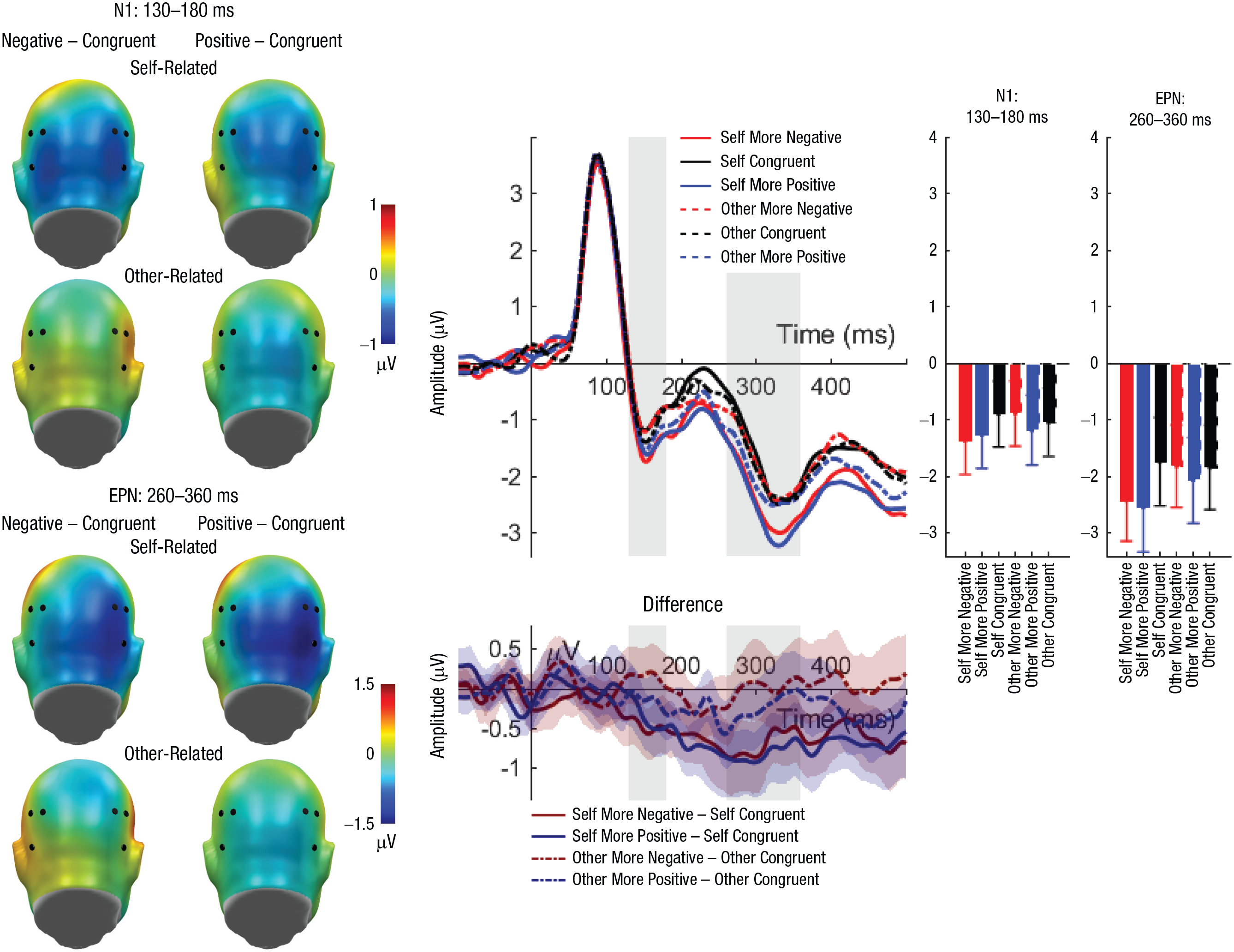 N1 and early posterior negativity (EPN): interaction effects of reference and evaluation congruency. Scalp topographies (left) depict differences between the negative and congruent conditions and positive and congruent conditions, separately for self-related and other-related evaluations. Black dots indicate positions of electrodes. The waveform graph (top middle) shows the time course of event-related potentials (ERPs) over the depicted average N1/EPN cluster, separately for incongruent positive, incongruent negative, and congruent self- and other evaluations. The gray shaded areas highlight the range of the N1 and EPN, respectively. The bar charts (right) show mean amplitudes for each evaluation type, separately for the N1 and EPN. Error bars represent 95% confidence intervals. The difference waveforms (bottom middle) show 95% bootstrapped confidence intervals of intra-individual differences in comparisons of interest.
