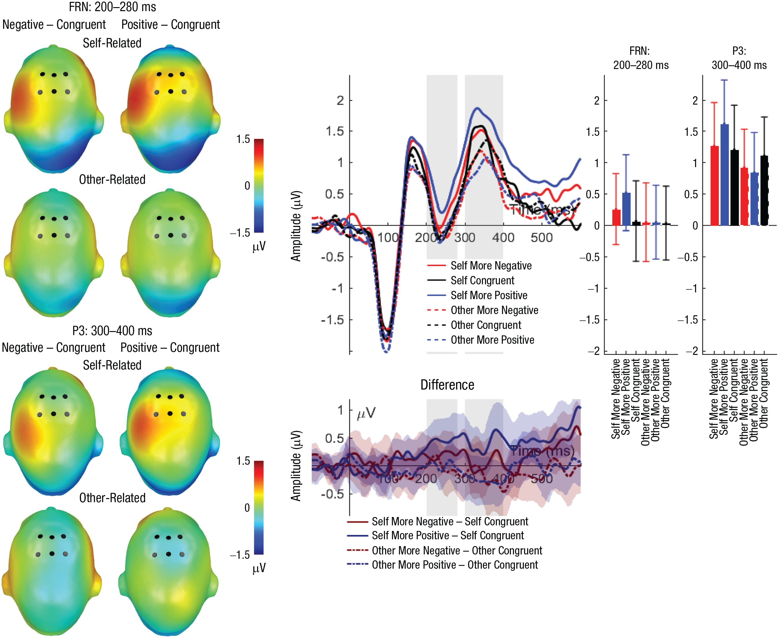 In the same time window, a main effect of self-reference was found for the FRN, which showed higher positivity for self-related evaluations. Although we found no main effect of congruency and no interaction, exploratory analyses showed more positive FRN amplitudes for self-related incongruent positive compared with congruent or incongruent negative feedback. Previous studies found larger FRN negativities for social rejections (e.g., Kujawa et al., 2014, 2017), and some mostly found an effect of feedback expectedness (van der Molen et al., 2017; Veen et al., 2016). One explanation might be that self-related positive evaluations are highly expected compared with all other conditions, in line with strong self-positivity biases (e.g., Korn et al., 2012; Sharot & Garrett, 2016). A second explanation might be that as this is the first study realizing a sort of baseline comparison (i.e., a congruent condition), this enables us to frame the findings into the large body of research relating the FRN as a reward positivity (Becker et al., 2014; Proudfit, 2015).