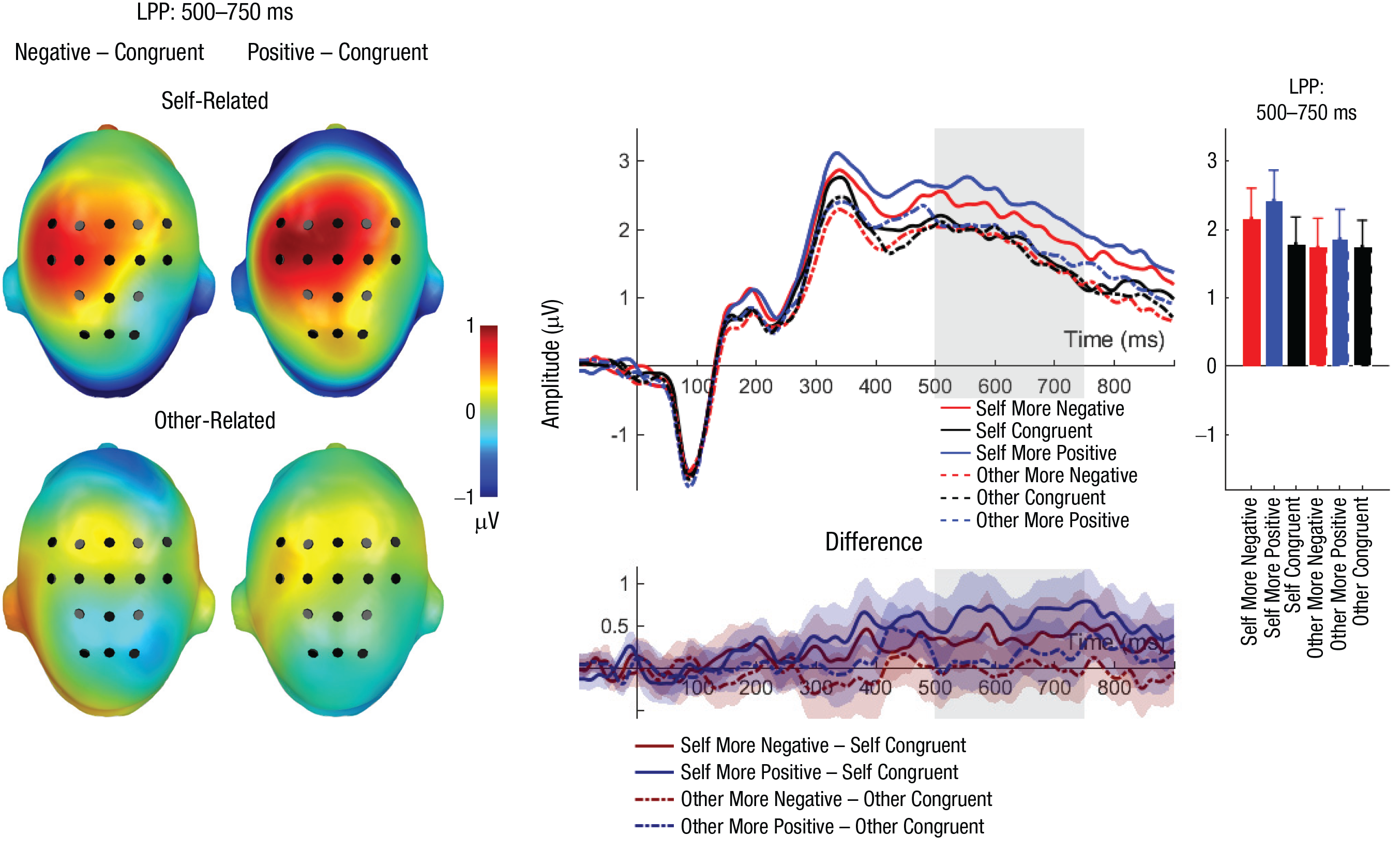 Late positive potential (LPP): main effects and interaction effects of reference and evaluation congruency. Scalp topographies (left) depict differences between the negative and congruent conditions and positive and congruent conditions, separately for self-related and other-related evaluations. Black dots indicate positions of electrodes. The waveform graph (top middle) shows the time course of event-related potentials (ERPs) over the depicted average LPP cluster, separately for incongruent positive, incongruent negative, and congruent self- and other evaluations. The gray shaded area highlights the range of the LPP. The bar chart (right) shows mean amplitudes for each evaluation type. Error bars represent 95% confidence intervals. The difference waveforms (bottom middle) show 95% bootstrapped confidence intervals of intra-individual differences in comparisons of interest.