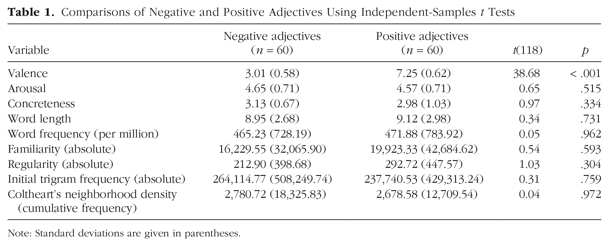 A stimulus set of 120 adjectives (60 negative, 60 positive) was selected. These adjectives had previously been rated by 22 students in terms of valence and arousal using the Self-Assessment Manikin (SAM; Bradley & Lang, 1994). We also created an analogous SAM scale for concreteness ratings, referring to the appropriateness of an adjective to characterize a person. These raters had been instructed to consider the adjectives’ valence, arousal, and concreteness in an interpersonal evaluative context. The selected adjectives were strictly matched with regard to their ratings and linguistic properties (word length, frequency, familiarity, and regularity), and eventually differed only in rated valence (see Table 1).