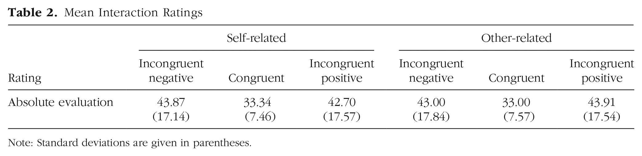 Participants also provided ratings about the interaction and evaluation both before and after Time 2 receiving evaluations from the other participant (Times 1 and 2, respectively; see Table 3). Compared with a hypothetical scale mean value, these ratings indicated above-average sympathy for the other participant, honesty of their submitted evaluations, and pleasantness. After participants received evaluations, their ratings indicated above-average ratings for perceived correctness, motivation to attend to self-related evaluations, and pleasantness (see Table 3).