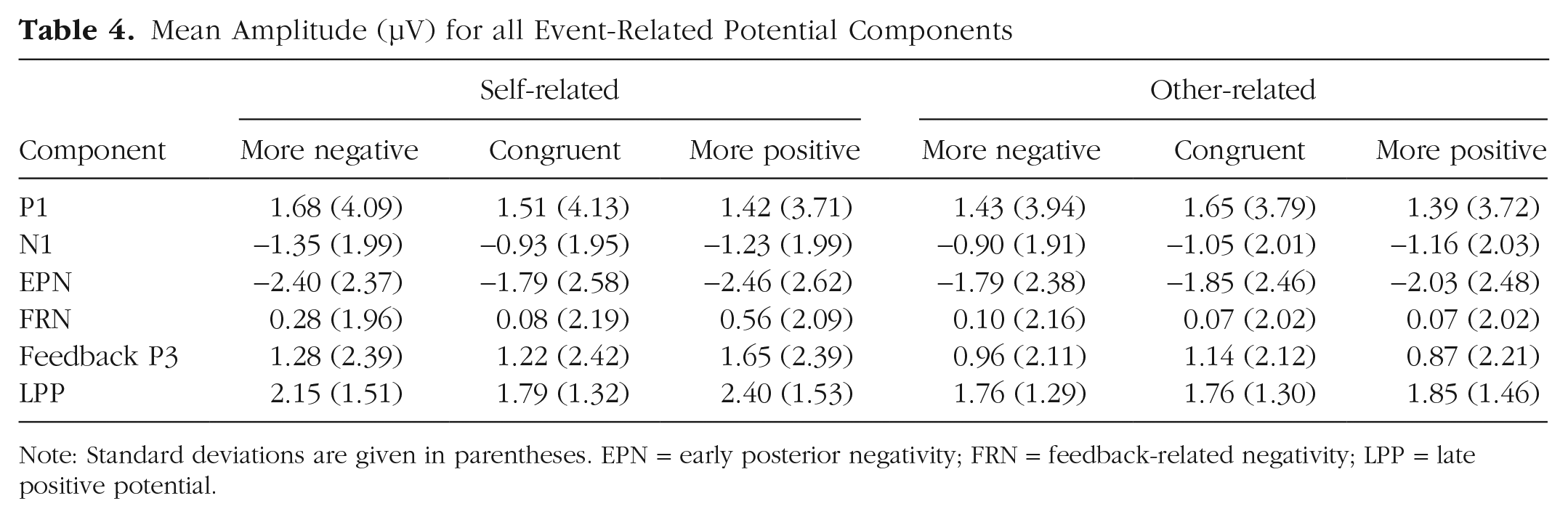 However, how recipients process evaluations during social interactions also depends on their expectations and on their self-concepts (see Kissler, 2020). The detection and integration of discrepant evaluations given by the interaction partner are a key aspect here (Shrauger & Schoeneman, 1979). Thus, the recipients’ own views and the way they process the received feedback matter strongly in social settings (Behrens et al., 2008), leading to the question of how neural correlates of feedback processing are modulated by the congruence and incongruence between the self-view and the evaluation given by the interaction partner. Here, performance and social-feedback studies identified two ERP components of special interest—the feedback-related negativity (FRN) and the feedback-related P3 (Becker et al., 2014; Kujawa et al., 2014; see also Pfabigan et al., 2011; van der Molen et al., 2017; Veen et al., 2016). The FRN is measured as a relative negativity after feedback, where negative feedback elicits a more negative deflection and positive feedback elicits more positive amplitudes (Hajcak et al., 2006). These relatively more positive-going amplitudes are also described as