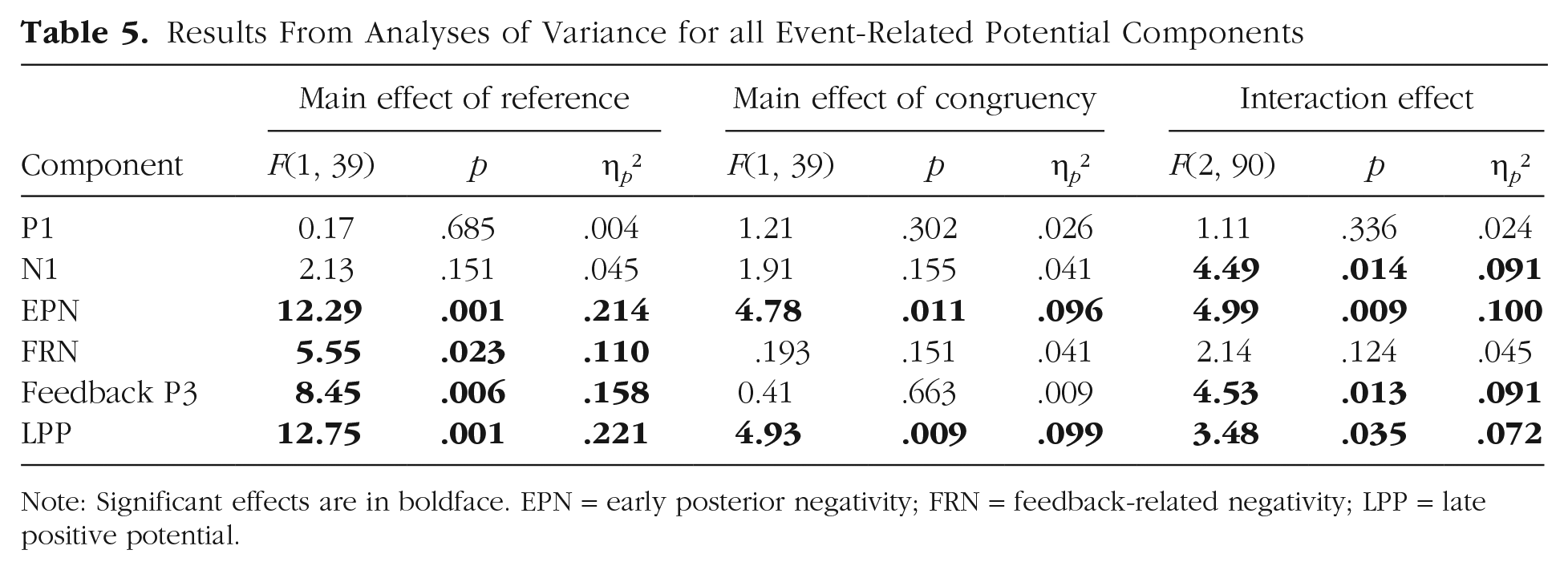 Note: Significant effects are in boldface. EPN = early posterior negativity; FRN = feedback-related negativity; LPP = late positive potential.