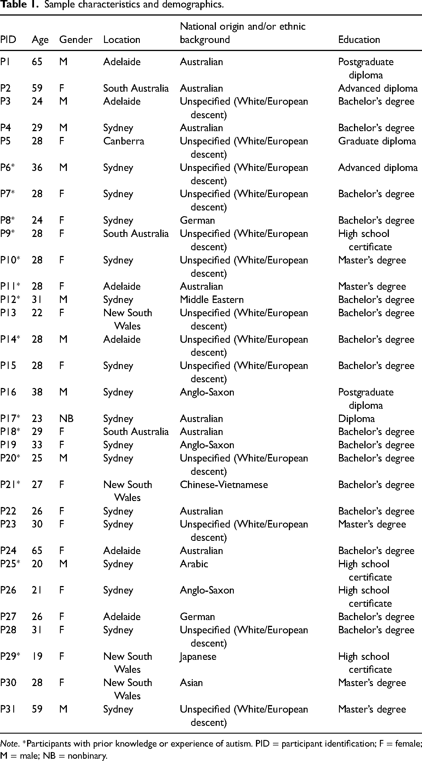 Ethics approval was granted by Monash Human Research Ethics Committee (MUHREC/35120) in August 2022. Purposive sampling was used to recruit participants living in Australia, proficient in English, and not identifying as autistic. No participation incentive was offered. The first author (MR) recruited participants via an invitation posted on social media, and data were collected via the Qualtrics survey platform. Participants consented by clicking “agree” to the explanatory statement detailing their rights to confidentiality and withdrawal from research. Prospective participants were screened via a question about autism diagnosis, and those who qualified for participation (i.e., not identifying as autistic) proceeded to answer demographic questions (viz., age, gender, location, education, and employment status). Participants were then asked about their prior knowledge and experience of autism to contextualise the sample further.