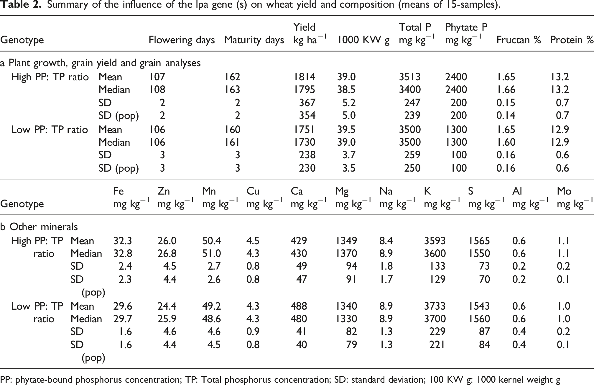 PP: phytate-bound phosphorus concentration; TP: Total phosphorus concentration; SD: standard deviation; 100 KW g: 1000 kernel weight g