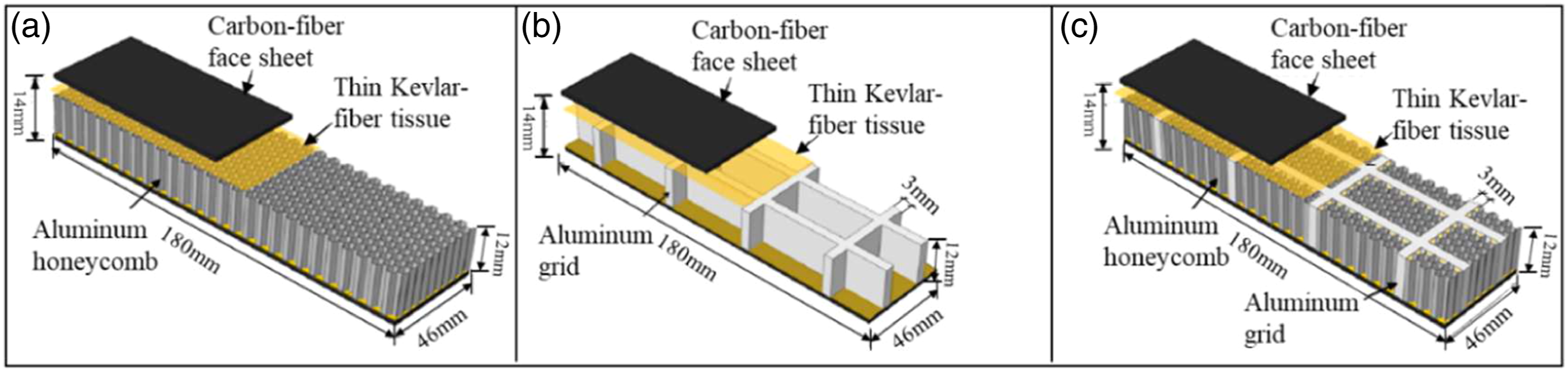 : (a) A sample, (b) A single honeycomb size, and (c) a single triangular core size (note that (b–c) have been redrawn according to the original images). Three aluminum honeycomb forms toughened by Kevlar fibers