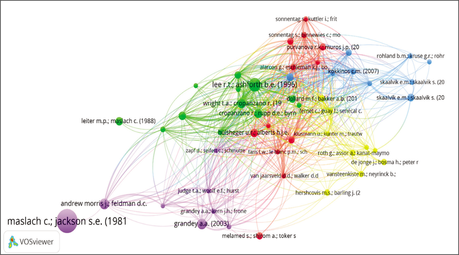 Examining the most influential works in the field of EE (RQ2) is vital to understanding the scholarly contributions that have shaped the research landscape. Table 3 presents the top 10 EE-related articles, highlighting key citation metrics that indicate their academic impact. The study by Maslach and Jackson (1981) is the most cited article with a total citation count (TC) of 7,089, as well as the highest citation density (CD: 164.86), reflecting its enduring relevance. The article also received 265 citations in 2024 (CCY) on Scopus, and it has garnered 24,321 citations on Google Scholar (CGS), further attesting to its wide reach. In contrast, Lee and Ashforth (1996) demonstrated substantial influence through their meta-analysis, which has accumulated 1,887 citations in Web of Science (CWoS). Their work also highlights demand–resource correlates as more closely tied to EE than to other burnout dimensions. The citation metrics, including FWCI and citation counts from multiple platforms, such as Google Scholar and Web of Science, underline the varying citation patterns across databases, with Google Scholar showing a broader citation distribution. Notably, the correlation between Scopus and Web of Science citations (