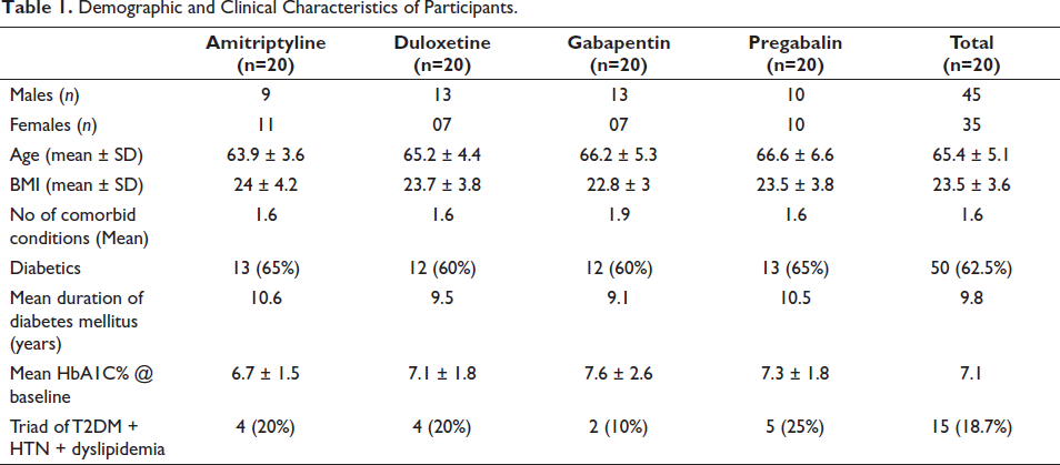 In the amitriptyline arm, 15 patients completed the study per protocol. Three patients had an inadequate response to the treatment and opted out of the study. One patient had excessive sedation and requested the physician for a change of treatment and was hence considered as a dropout and one patient was lost to follow-up. In the duloxetine arm, 12 patients completed the study per protocol. There were eight dropouts in this arm. One patient died due to a COVID-19 infection, one patient left the study due to severe headache, another patient left the study due to excessive sedation, one patient refused to participate in the trial further after two weeks of recruitment, two patients had inadequate response and hence opted out of the study, and two patients were lost to follow-up. In the gabapentin arm, a total of 14 patients completed the study per protocol. There were six dropouts in this arm. One patient exited the study due to inadequate response, and five patients were lost to follow-up. In the pregabalin arm, a total of 18 patients completed the study per protocol. Two were lost to follow-up in this arm.