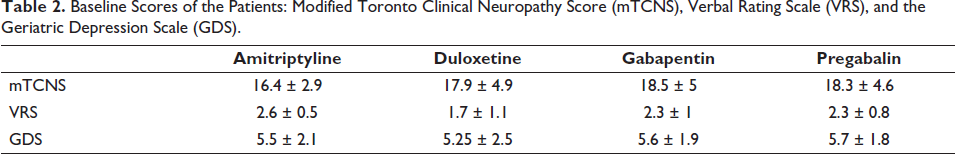 Baseline Scores of the Patients: Modified Toronto Clinical Neuropathy Score (mTCNS), Verbal Rating Scale (VRS), and the Geriatric Depression Scale (GDS).