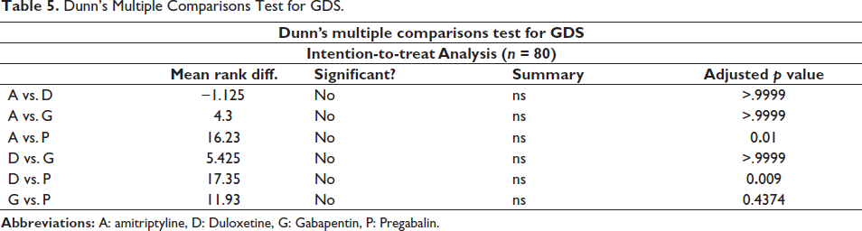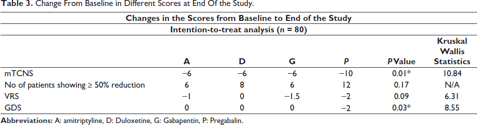 We also observed improvements in the VRS at week 8 for all the four treatment pathways, with no significant differences among the four treatment arms. We observed improvements in the GDS at week 8 for all the four treatment pathways; statistically significant difference was found between the amitriptyline and pregabalin arms (