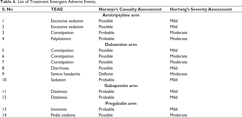 A total of 14 treatment emergent adverse events were noted, with the distribution of 4, 6, 2 and 2 in amitriptyline, duloxetine, gabapentin and pregabalin arms, respectively. According to Naranjo’s causality assessment, 1 ADR was definite, 6 ADRs were probable, and 7 ADRs were possible. According to Hartwig’s severity assessment, 8 ADRs were mild and 6 ADRs were moderate in severity. The most common system involved was the central nervous system followed by the gastrointestinal system and cardiovascular system. All the ADRs were reported PvPI. The list of ADRs, their causality and severity assessment are depicted in Table 6. All the adverse events were well known, and no serious adverse events were noted.