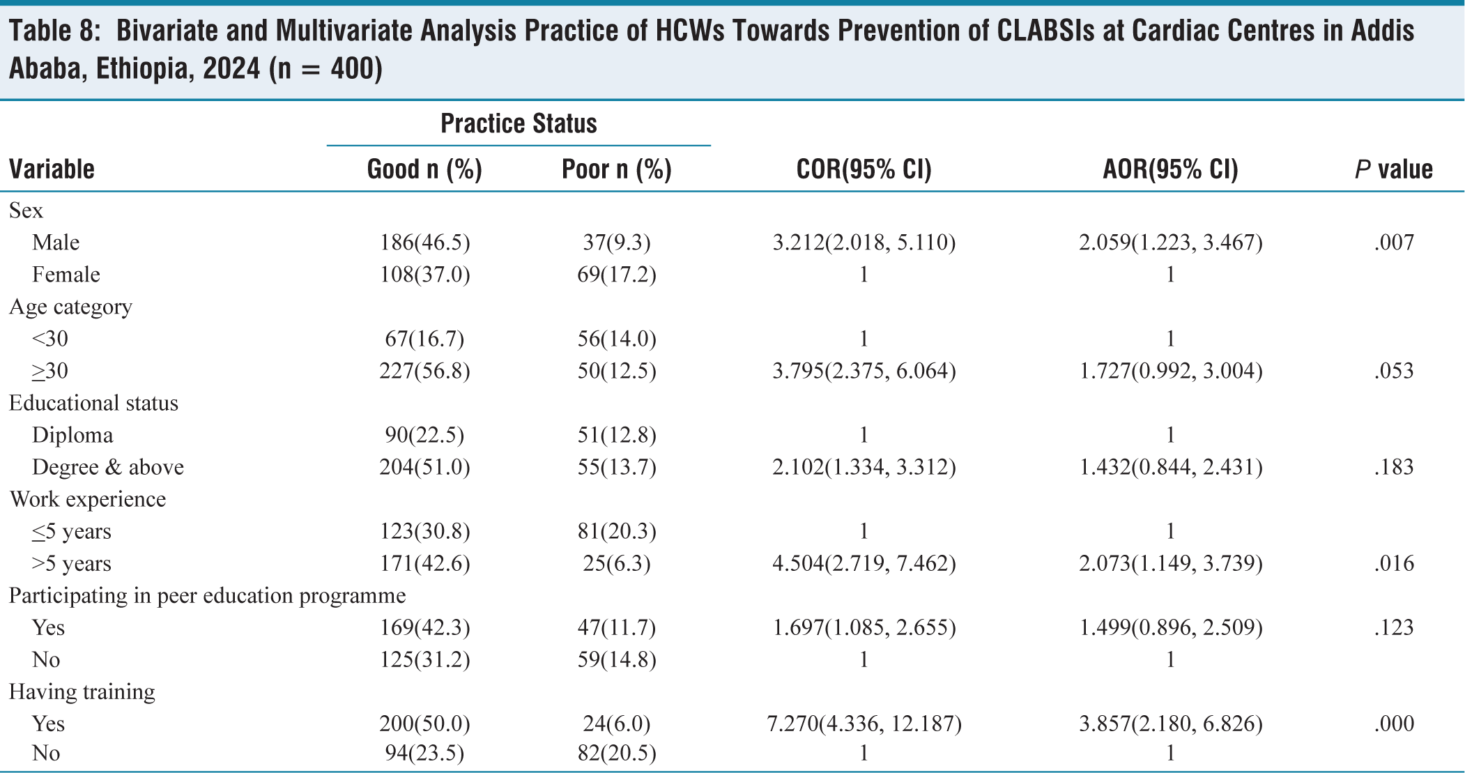 Bivariate analysis was conducted to identify factors associated with HCWs practice of CLABSIs. Sex of respondents, age category, educational level, work experience, participation in peer education programmes, and training regarding infection prevention on CLABSIs were found to have
