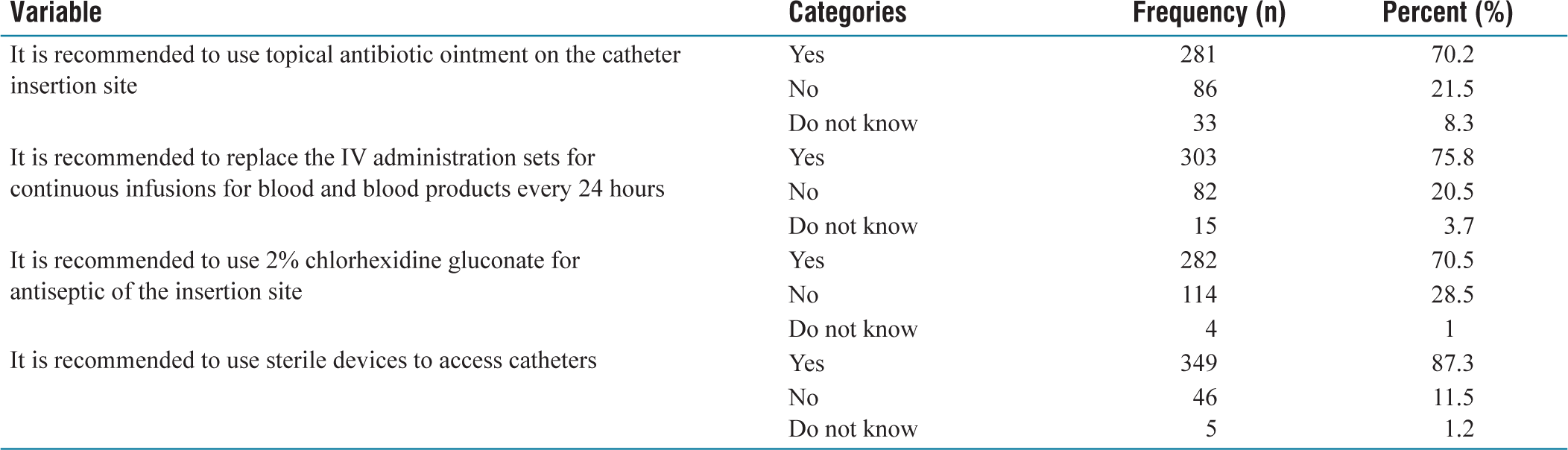 From the participants, 294 (73.5%) of them had good practice towards prevention of central line-associated bloodstream infections. From the participants, 344 (86%) of them used to change the dressing on the CVC insertion site. Two hundred 10 (52.5%) of them used to clean the CVC site before disinfection. The majority of the participants (66.5%) used to allow the antiseptic to dry before proceeding. The majority (78.3%) of them used to perform the disinfection of the CVC access port before administering therapy. Finally, two hundred sixty-six (66.3%) of them were used to replace the intravenous (IV) administration sets