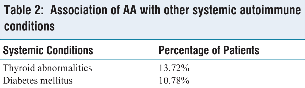 It is also important to consider the inbuilt limitations of this study here. Since the sample involved in the study is limited to a single hospital setting, that limits the external validity of the findings due to differences in patients’ characteristics and demographic factors across different hospitals. Also, since there is no long-term follow-up, the disease’s evolution over time and development of systemic conditions in future cannot be elucidated because of the cross-sectional design of the study. Considering the above factors, these might affect the generalisability of these findings compared to large cohort studies with long-term follow-up. Although the statistical association with diabetes suggests insignificance in our study, it might be of note that this might be the reflection of a smaller number of moderate and severe cases compared to milder presentations, which are the most common presentation in our cohort of patients. Nevertheless, in addition to thyroid, this association also needs to be evaluated in all the cases of AA for better management and holistic care of the patient.