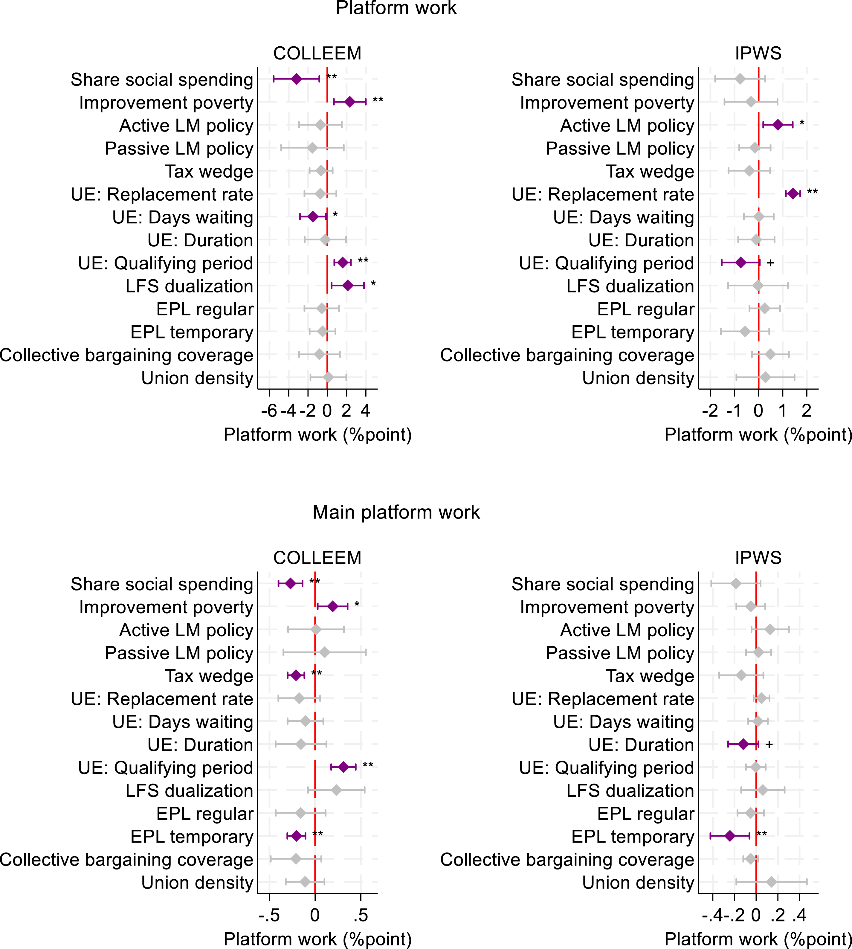 To elucidate these differences further, Figure 4 shows the estimated relationship between different characteristics of the welfare state regime and the prevalence of taking up any platform work (top) or doing platform work as the main professional activity (bottom). Full coefficients are shown in Table A5, and all coefficients are shown for social spending in A6; others are available upon request. Estimated relationship between contextual factors and propensity to do platform work. Note: Figure shows the estimated relationship between a one standard deviation increase in a contextual factor on the individual probability of taking up platform work [top] or main platform work [bottom] in % points, with 95% C.I., estimated from weighted binary logistic regressions of each contextual factor separately, and controlling for education, age, country of birth, gender, age, having a child, unemployment rate, and GDP, with standard errors clustered by country. UE indicates unemployment benefits. +: