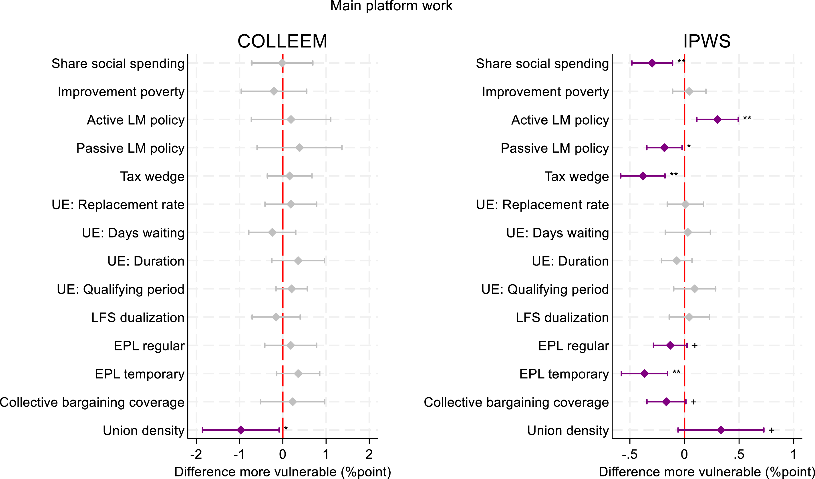 Figure 5 shows the estimated difference between a respondent who is relatively more at risk of not working or working in a non-standard job given their characteristics rather than someone who is less at risk (one standard deviation above vs one standard deviation below). A positive association means that the link between the institutional factor and reliance on platform work is more positive for more vulnerable workers; while a negative association means there is a greater shielding of vulnerable workers. (Table A6) Estimated difference between relatively more and less vulnerable workers. Note: Figure shows the estimated relationship in a contextual factor on the difference in doing platform work that makes up over 50% of annual earnings (%points) between workers at one standard deviation above the country-specific measure of non-standard risk and those at one standard deviation below, with 95% C.I., estimated from weighted binary logistic regressions of each contextual factor separately, interacted with the individual risk of non-standard work, and controlling for education, age, country of birth, gender, age, having a child, and country fixed effects. +: