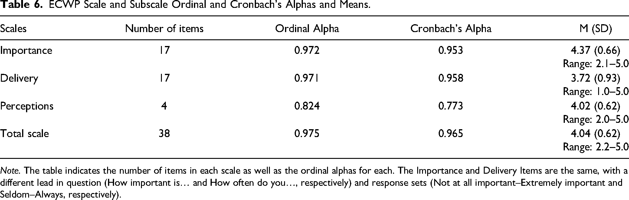 ECWP Scale and Subscale Ordinal and Cronbach's Alphas and Means.
