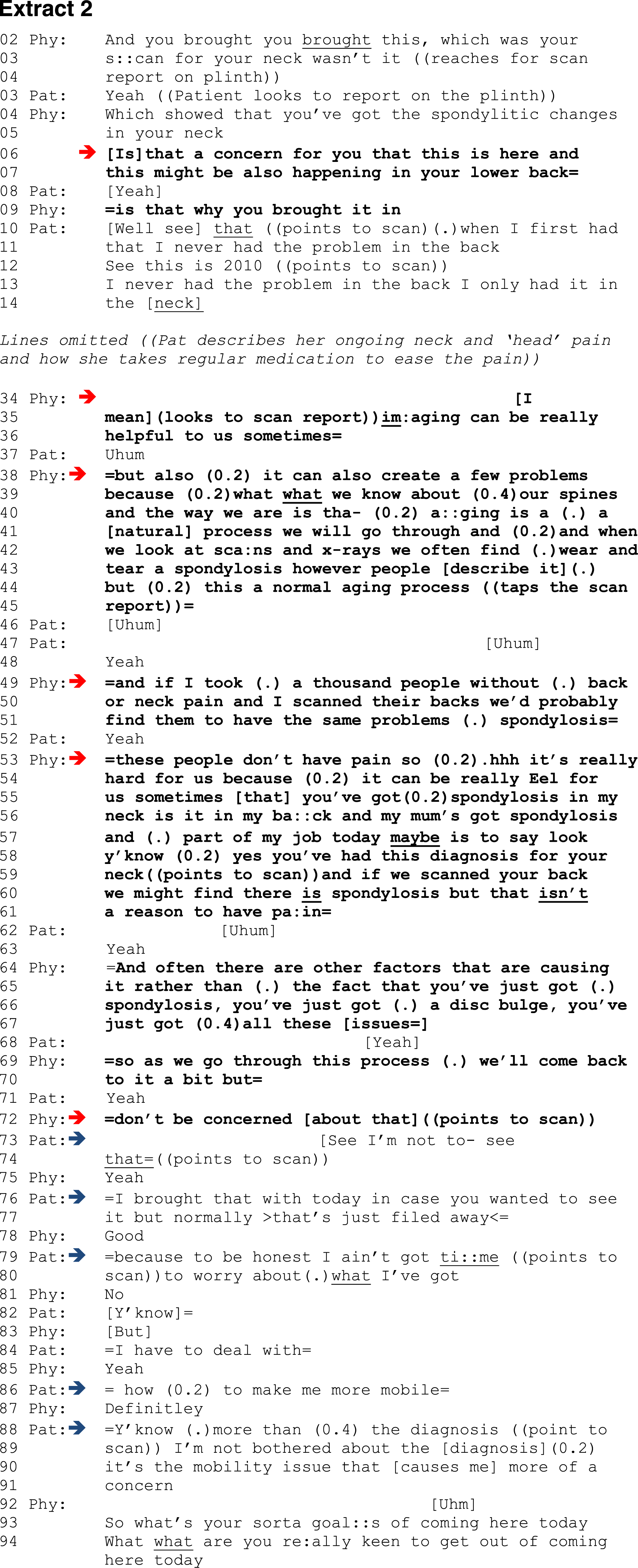 Extract 1 comes at the end of the consultation, in the explanation and planning phase. It starts with the physiotherapist’s empathic statement recognizing the impact that the LBP has had on the patient: “I can see …. is .. really affectin- you.” This is acknowledged by the patient with a simple nod of the head. What follows in the next turn is the physiotherapist’s attempt to reassure the patient, which is initially constructed as a broad reassuring statement (lines 07–08): “don’t be too concerned.” The physiotherapist then specifically targets the patient’s scan findings (lines 09–10 and 12–14), presuming that this is the patient’s focus of concern. The physiotherapist frames the patient’s findings as minimal: “it’s not it’s not a [major thing].” We observed similar examples in these data of physiotherapists minimizing the patient’s condition in this way to communicate more positive perceptions about patients’ scans (see also extract 2, lines 40–45; extract 3, line 16; extract 4, lines 49–52). However, the patient’s overlapping response (lines 15–16) and the interactional features of that response indicate some resistance to this. The cut-offs on “[Yeah that’s]- that's,” and the quiet downward intonation of