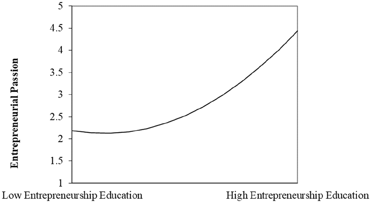 We expected that entrepreneurship education would demonstrate a curvilinear association with entrepreneurial passion. In light of social cognitive theory (Bandura, 1986), entrepreneurship education represents one of the environmental factors that influence entrepreneurial passion, which is considered a personal factor. When entrepreneurship education moves from a low to moderate level, as theorized earlier, the conflict between a student’s own perception and classroom-based theory is likely to grow (Schellenberg & Bailis, 2015), which discourages them from being dedicated and making an effort to start a business. As entrepreneurship education hits a moderate level, resistance to risks, and uncertainties among students may increase. As a consequence of the difficulties linked to the moderate levels of entrepreneurship education, entrepreneurial passion may diminish, leading to the negative association between entrepreneurship education and entrepreneurial passion.