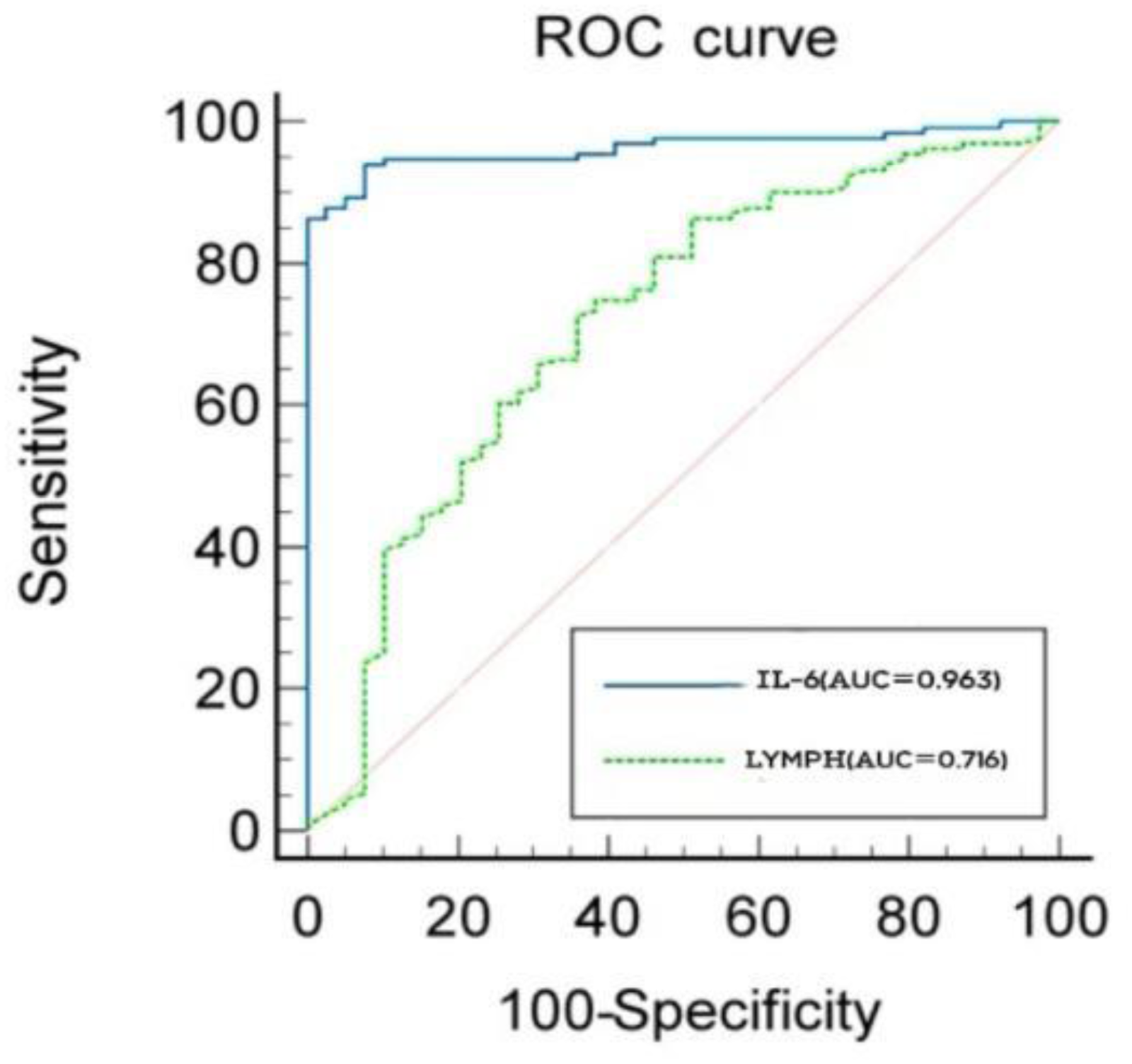 The receiver operating characteristic (ROC) curve of LYMPH and IL-6 for SIC.