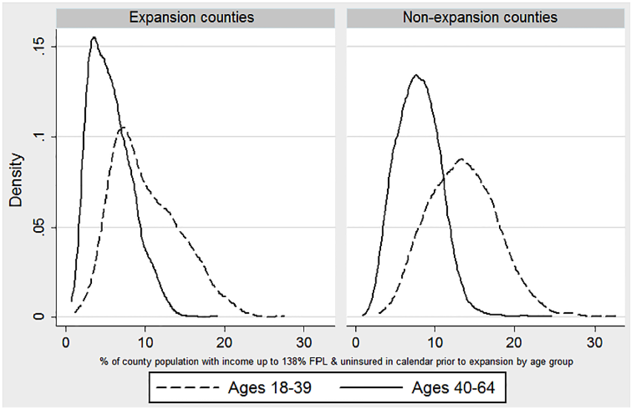 Key to the estimation strategy, discussed in the following section, are data on the relative size of the potentially affected Medicaid expansion population in the calendar year immediately prior to expansion. Specifically, we use estimates on the percent of each county’s population, aged 18 to 39 and 40 to 64, that was uninsured with family income up to 138% of the FPL—the income eligibility threshold in expansion states. These age categories were chosen because they are the most refined categories available. These data are produced by the Small Area Health Insurance Estimates (SAHIE) group at the U.S. Census Bureau. They are model-based estimates based on information from the American Community Survey, IRS federal tax returns, the 2010 decennial Census, population estimates from the Census Bureau’s Population Estimates Program, County Business Patterns data from the Business Register, and administrative data on participation in Medicaid, CHIP, and the Supplemental Nutrition Assistance Program (Bauder, Luery, & Szelepka, 2015; U.S. Census Bureau, 2016).