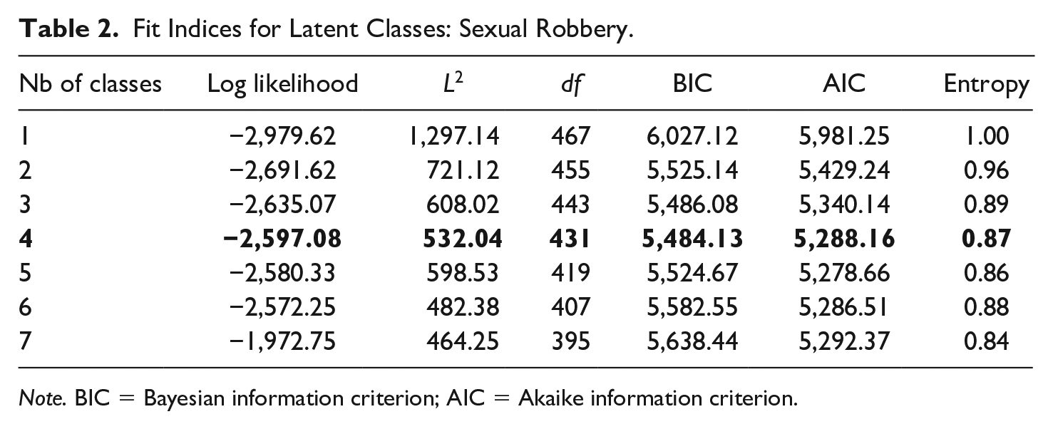 Our analytical strategy included a two-step process. First, to determine the extent that criminal expertise behaviors vary for both sexual burglary and sexual robbery, we employed latent class analysis (LCA) using Latent Gold V5.1 software package. LCA is a statistical procedure used to identify heterogeneity that is not directly observable or measurable and therefore can be used to detect patterns in a set of data or subgroups based on shared behavioral characteristics (Collins & Lanza, 2010). More specifically, LCA is to identify mutually exclusive cases (i.e., with no overlap) on the basis of dichotomous indicator variables (Lanza et al., 2007, 2003). LCA is similar to cluster analysis but provides stronger models because it attributes class membership probabilities to each individual case. We computed and analyzed one-to-seven class solutions for both samples separately (see Tables 1 and 2). The Bayesian information criterion (BIC) was used to evaluate the model fit and determine the number of classes to use in LCA. Schwarz (1978) mentioned that a lower BIC value indicates an improvement in the fit of models. We also used other fit measure: log-likelihood ratio L2, degrees of freedom, Akaike information criterion (AIC), and entropy. In the second step, we used additional variables to improve the depth of our models. We used bivariate analysis (i.e., chi-square analysis and Kruskal–Wallis Test) and post hoc testing to identify significant differences between the subgroups.