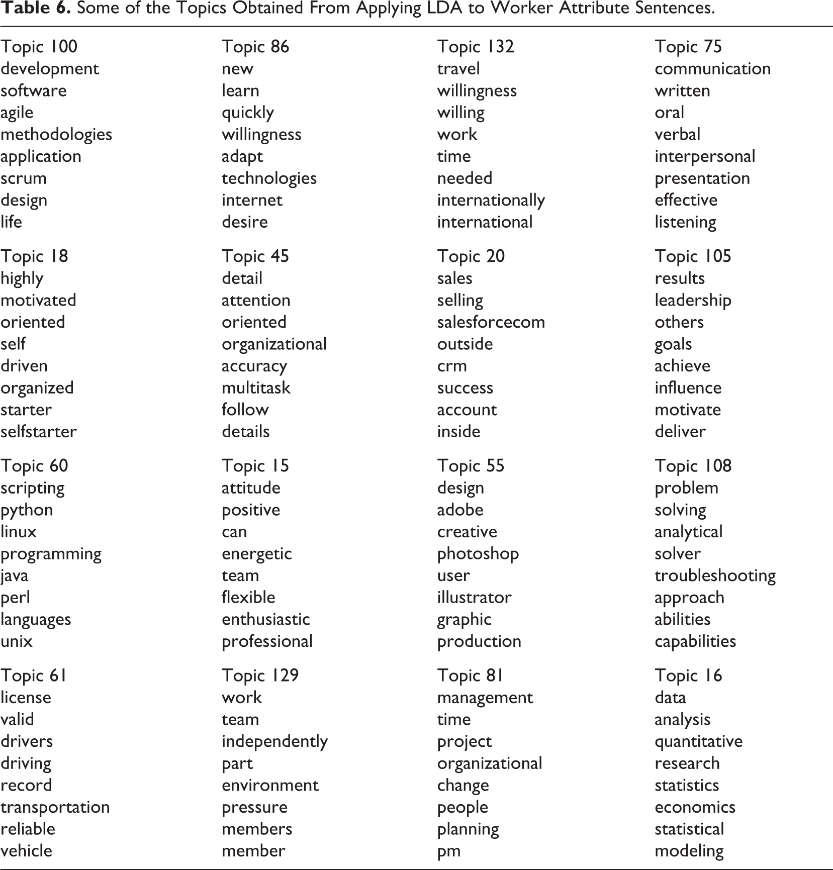 Some of the Topics Obtained From Applying LDA to Worker Attribute Sentences.