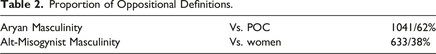 The dominant gender strategy, which I term “Aryan masculinity,” projects a protective patriarchal identity reflecting traditional white-nationalist beliefs around women and family and is reflected in 59% of posts. In contrast, users adopting alt-misogynist masculinity enact an aggressive and domineering masculine strategy rooted in alt-right ideologies, particularly the manosphere’s misogyny. This strategy appears in 41% of posts that attacked women, expressed men’s victimization, depicted marriage as a mere social contract, and promoted enforced gender roles and women’s (violent) subjugation. I argue that what lies at the heart of these masculine gender strategies is competing definitions of the “other” that reveal differing ideologies around race, class and, most importantly, gender. Those enacting Aryan masculinity construct their identity mainly in opposition to racialized men, as reflected in 62% of coded posts, while alt-misogynists use women in 38% of coded posts (table 2).