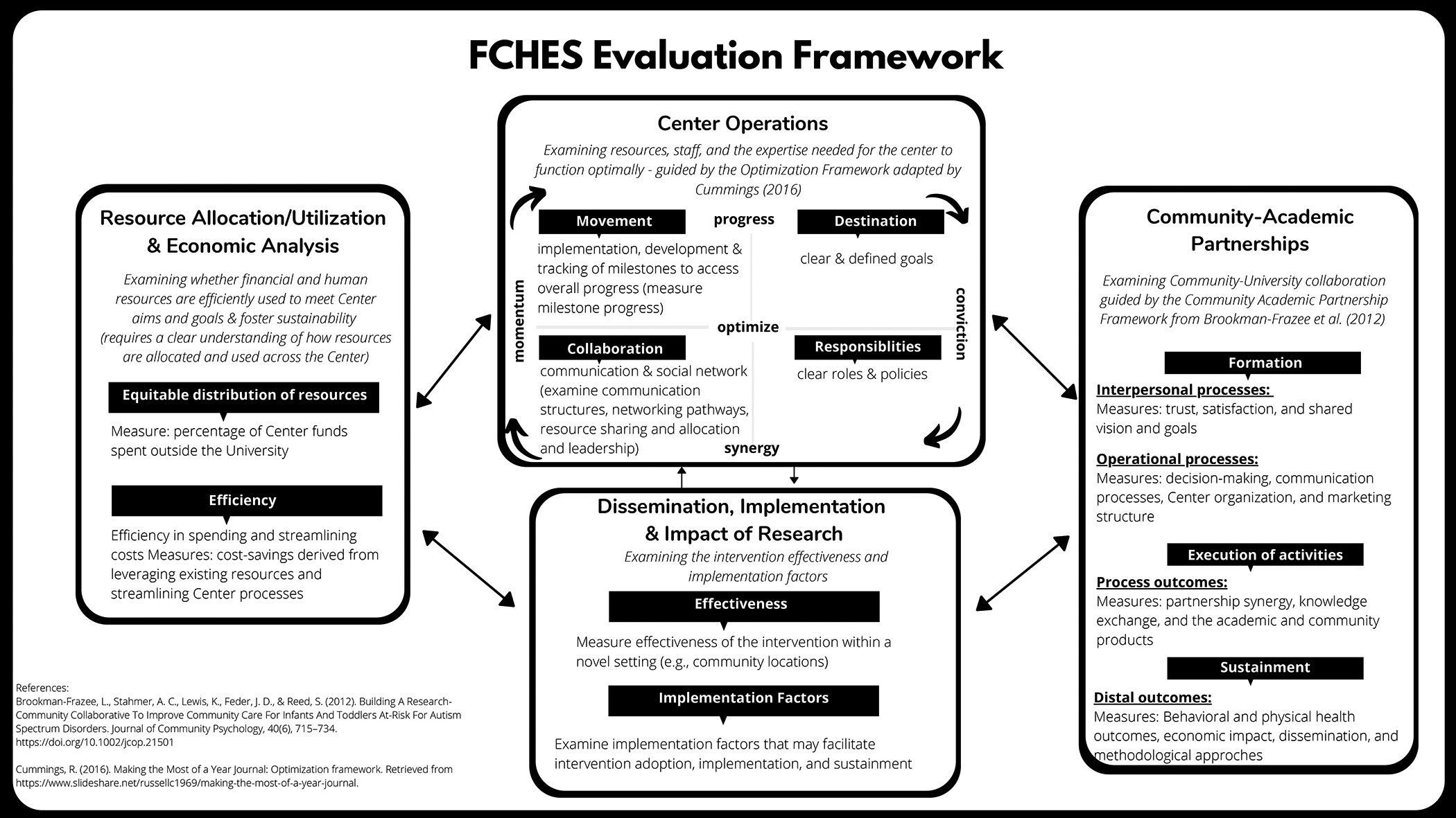In the sections that follow, we provide an overview of the overarching FCHES evaluation framework and describe the various theoretical models that comprise this framework. The conceptual framework shaping the evaluation moved beyond merely assessing the progress and impact of the interventions, which is the focus of most evaluations of large initiatives. The framework was used to assess the Center’s functional operations, how resources are allocated and utilized, the active and consistent collaboration between academic and community partners, and the dissemination and impact of the Center’s research products and economic impacts. Hence, the evaluation team, which included an external evaluator, a research assistant, a community partner, an academic partner, and an economist, developed a comprehensive overarching framework. Drawing from concepts and methods from multiple disciplines, this comprehensive conceptual framework was used to understand the evaluation of a TCC (FCHES). The four integrated theoretical models underlying the comprehensive evaluation focus on organizational optimization (Cummings, 2016), economic evaluation and cost-effectiveness, research–community partnership (Israel et al., 2005), and dissemination and implementation science (Robinson et al., 2005). Figure 1 illustrates the linkages between the four theoretical models informing the evaluation, reflecting how each element interacts and influences each other. The framework was refined through a collaborative process with Center leadership and community partners to ensure that it reflected the various FCHES stakeholders’ important elements. Later in the paper, we discuss the evaluation questions, data collection, analysis methods, and results from a pilot study utilizing this conceptual framework.