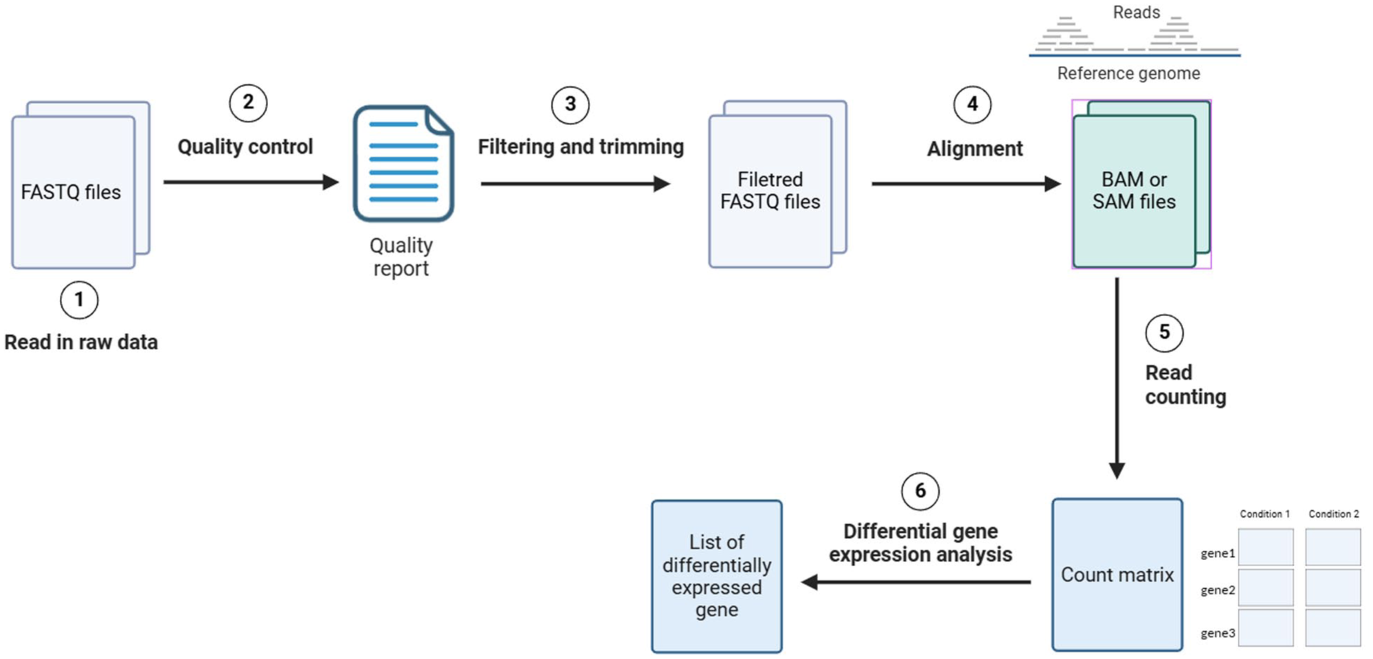 To carry out this analysis, users need to provide a count matrix, which should be generated during the quantification step, along with a metadata file. The metadata file must include a column that indicates the experimental conditions for each sample. The column names of the count matrix must exactly match the row names of the metadata and be in the same order to ensure proper mapping of sample information. This alignment is crucial because DESeq2 relies on the metadata to assign experimental conditions to each sample. Any discrepancies in names or order could lead to errors or inaccurate analyses. Ensuring this consistency is essential for preventing errors and enhancing the accuracy of the analysis. The process begins with DESeq2 normalising the raw counts by estimating size factors to account for variations in library depth. It then estimates gene-wise dispersion values to capture biological variability, fits a generalised linear model for each gene and conducts tests for differential expression. This final step involves calculating log2 fold changes, standard errors, Wald test statistics, raw