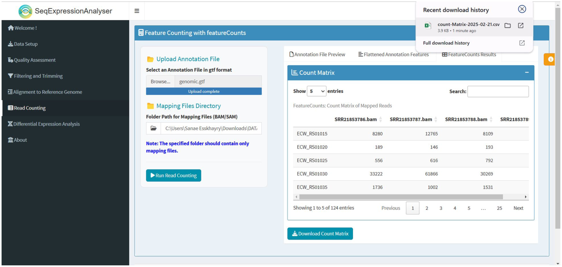 The SeqExpressionAnalyser uses the RsubRead package to align sequencing reads to a user-provided reference genome. 16 To perform this alignment, the user must provide key input parameters, including the input readfile1 (for single-end reads, this is the FASTQ file; for paired-end data, it refers to the forward file). If applicable, users should also specify readfile2 for mate reads. In addition, users must specify the desired output format for the aligned data, choosing between SAM and BAM, depending on how they intend to store the alignment results and the type of sequencing data being analysed. Once the alignment process is complete, the tool generates output files containing the aligned reads and saves them in the same directory as the input data. Along with these files, a results table is generated that summarises key mapping statistics for each sequencing library (Figure 5). This table presents essential information, including the total number of reads, the number of successfully mapped reads, the count of uniquely mapped reads, the number of multi-mapped reads, and the number of detected insertions and deletions (Figure 5). These metrics provide valuable insights into the quality of alignment and help evaluate the efficiency of the sequencing and mapping processes. A well-executed alignment typically yields a high percentage of uniquely mapped reads, ideally 70%-80% or higher. It should have a low proportion of multi-mapped reads, preferably under 10%, along with an acceptable number of insertions and deletions. In addition, the total number of mapped reads should be substantial, ideally constituting at least 80% of the total reads. A lower mapping rate may indicate quality issues in the sequencing data or in the reference genome. Reducing the occurrence of multi-mapped reads is essential to eliminate ambiguity and ensure accurate assignment of reads to their genomic locations.