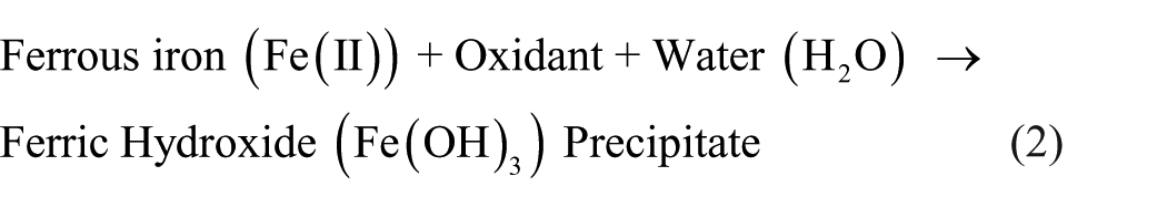 Electrocoagulation is another method used to remove iron from drinking water. Vasudevan et al. (2009) have applied the electrocoagulation process, where stainless steel was used as the cathode and aluminum alloy was used as the anode (Vasudevan et al., 2009). The maximum iron removal efficiency of 98.8% was achieved at pH 6.5 and a current density of 0.06 A dm−2 (Vasudevan et al., 2009). Ion Exchange Technology is another iron removal technology used in water treatment. Ion exchange process removes nitrate ions, heavy metals, as well as undesirable calcium and magnesium ions that are responsible for hardness of water. Fink (2018) stated that the conventional ion exchange resin made from 17 phenol, acrylates or polyamines could be further modified and designed accordingly to allow higher selectivity of specific active site towards certain metal ions. Polymeric resin will interact with the dissolved ion in the water by attracting the ion of opposite charge. The attractive force and bond strength between the attached ion and the functional group are relatively weak (Musa et al., 2023). Therefore, ion exchange process occurs continuously through trapping of particular ion and releasing of another ion in water. Other than chemical precipitation, ion exchange, and adsorption process, oxidation is another conventional technology that has been widely adopted in water treatment plants for iron removal (Khatri et al., 2017). Oxidation is a process that involves electron transfer (Shammas et al., 2005). Chemical oxidation is a treatment process that converts the dissolved ferrous iron (Fe2+) in water into ferric iron (Fe3+) with the aid of oxidizing agents. Oxidation of iron in a water treatment plant can be carried out using liquid oxidants such as sodium hypochlorite, potassium permanganate, or hydrogen peroxide, or using dissolved gases such as oxygen, chlorine, and ozone (El Azher et al., 2008). The chemical oxidation method is considered superior to other technologies due to its capability to effectively remove iron from water (Elsheikh et al., 2020). Besides that, most of the chemical oxidants used for iron removal have powerful antibacterial effects and be able to act as strong disinfectants in water treatment plants (El Araby et al., 2009; Villamena, 2013).