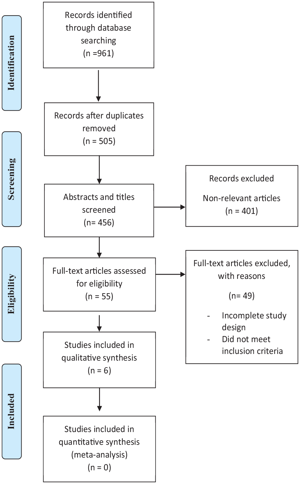 Initially, 961 citations were identified by the search of the electronic databases. After removing the duplicates and the prior versions of the updated SRs, 456 titles and abstracts were screened. Fifty-five SRs were deemed eligible for the final review of the full-text articles. Eventually, 6 SRs met the inclusion criteria of this overview and were included in the final synthesis of the evidence (please refer to Figure 1). In all these SRs, a sample of people with upper extremity arthritic disorders was included, and at least one outcome measure specific to arthritic conditions was assessed.
