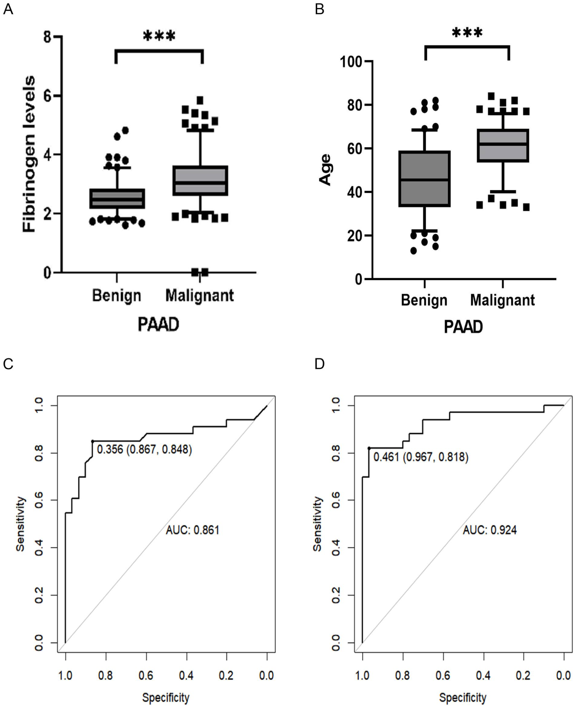 Statistical table of clinical data of patients with benign and malignant tumors of the pancreas and ROC curves of subjects with fibrinogen level, UAE, and CA19-9 in patients with benign and malignant tumors of the pancreas. (A) Point-box plot of fibrinogen levels in benign and malignant tumors of the pancreas. Fibrinogen levels in the group of malignant tumors of the pancreas were significantly higher than those in the group of benign tumors of the pancreas. (B) Dot-box plots of age statistics of patients with benign and malignant tumors of the pancreas. The pancreatic malignant tumors of the patients were significantly older than patients with benign tumors of the pancreas. (C) Working characteristic curve of subjects with CA19-9 in patients with benign and malignant tumors of the pancreas, with a specificity of 0.867, a sensitivity of 0.848, and an AUC of 0.861. (D) Working characteristic curves of subjects with CA19-9, UAE, and CA19-9 in patients with benign and malignant tumors of the pancreas. Working characterization curve with specificity of 0.967, sensitivity of 0.818, and AUC of 0.924.