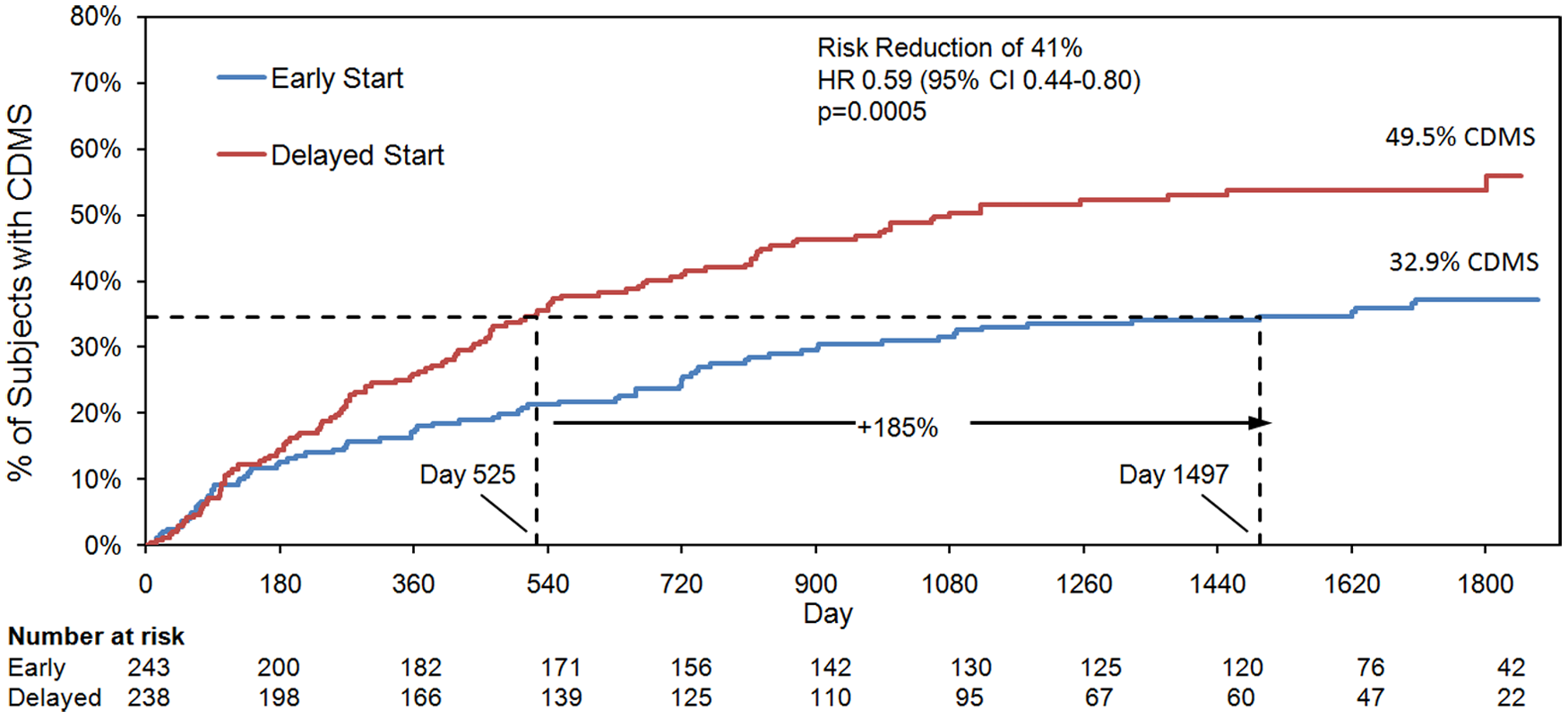 Early GA treatment was associated with a 41% reduced risk of CDMS compared with delayed GA treatment (HR: 0.59; 95% CI: 0.44–0.80;