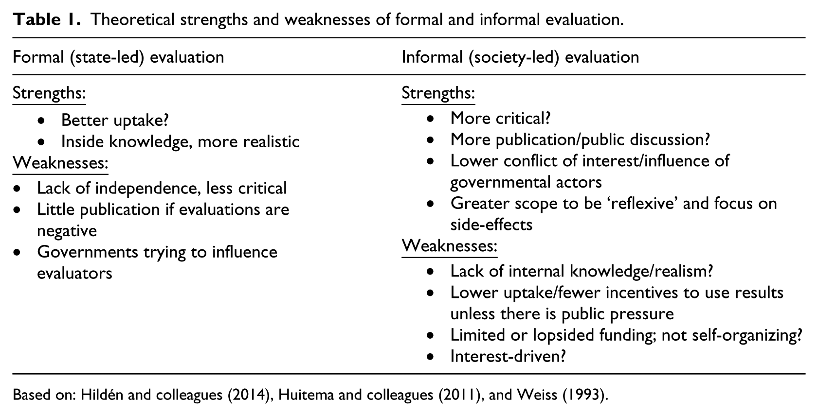 For analytical purposes, evaluation scholars have found it useful to distinguish between formal (i.e. government-driven) and informal (i.e. society-driven) modes of evaluation. In a ground-breaking article, Weiss (1993) distinguished between ‘inside evaluation’ conducted by people ‘inside’ government, and ‘outside evaluation’ by actors not linked with government (see also Conley-Tyler, 2005). Other researchers have developed the related notions of ‘formal’ versus ‘informal’ evaluation in the EU (Hildén et al., 2014; Huitema et al., 2011). Hildén and colleagues (2014) define formal evaluation as ‘state-led’ and informal evaluation as ‘evaluation activities by non-state actors’ (p. 885). Crucial for this article is the fact that each mode comes with a set of potential strengths and weaknesses, which the following section considers.