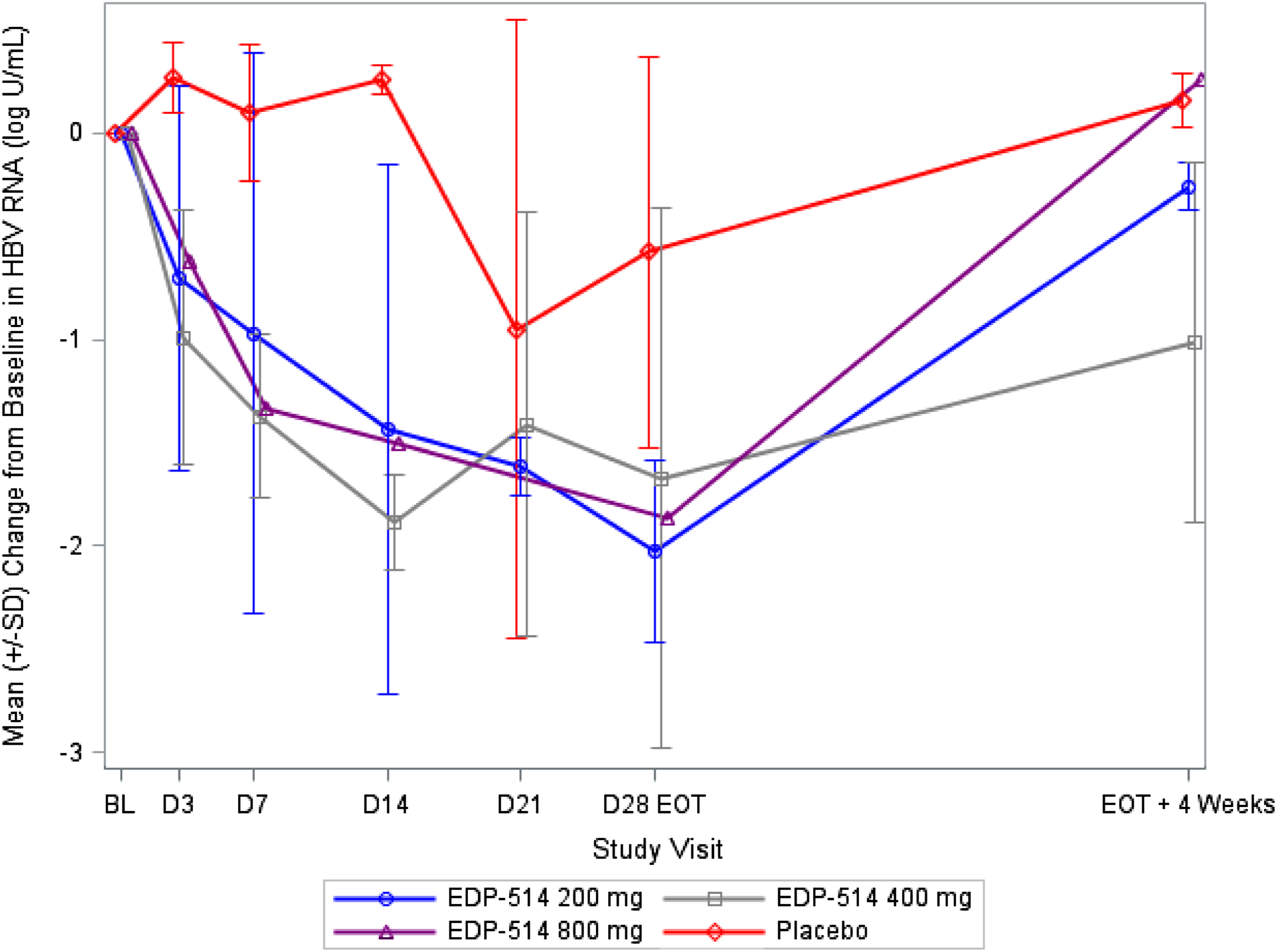 For subjects with quantifiable HBV RNA at baseline (Supplementary Table 1), mean change from baseline to Day 28 for HBV RNA was −2.03, −1.67, −1.87, and −0.58 log U/mL in the 200 mg ( HBV RNA reduction in EDP-514 versus placebo groups in NUC-suppressed CHB patients. Mean (SD) change from baseline versus time for HBV RNA among those with quantifiable levels at baseline. HBV, hepatitis B virus; CHB, Chronic hepatitis B.