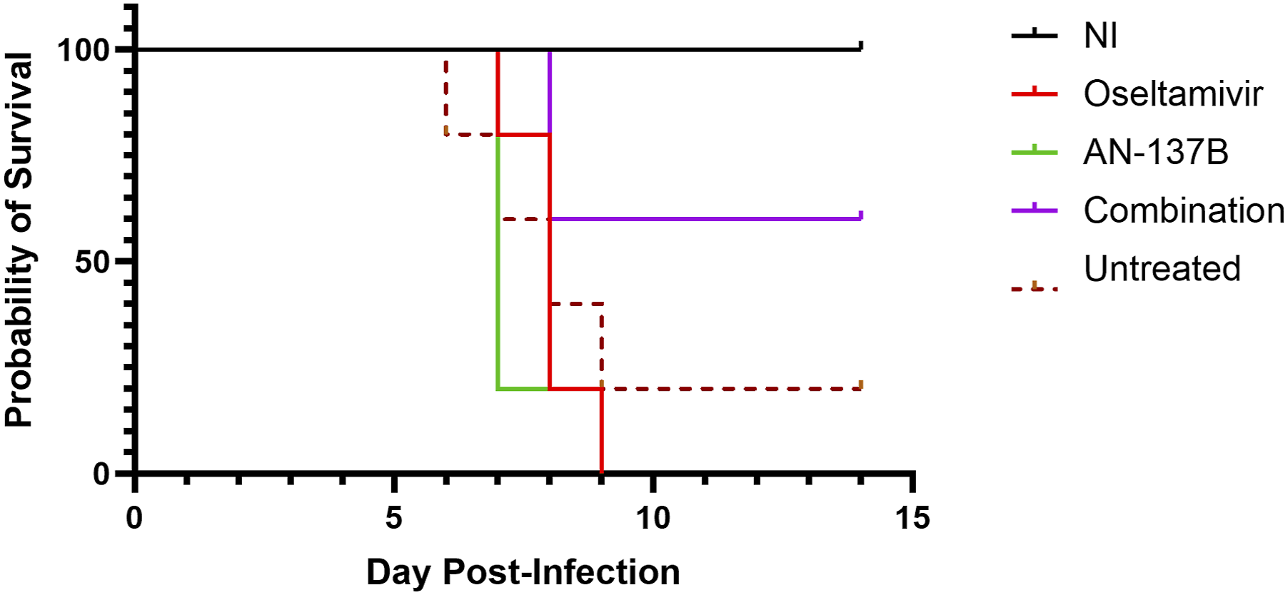 As expected, intranasal inoculation of mice with 200 PFUs of influenza A/Puerto Rico/8/1934 (H1N1) virus resulted in clinical signs of infection such as body weight loss, lethargy and mortality that were observed in the four infected groups of mice with no signs being observed in uninfected animals. As shown in Figure 1, 4/5 animals (80%) in untreated and infected animals and all animals (5/5; 100%) in groups that received single oseltamivir or AN-137B treatment were humanely euthanized or died between day 7 and day 9 p.i. Only, 2/5 animals (40%) of mice that received the combination of oseltamivir and AN-137B were humanely euthanized. Accordingly, important body weight losses, in particular during days 5–9 p.i., were observed in infected animals while no signs of infection were observed in the uninfected group (Figure 2). Of interest, body weight loss was remarkably lower in the group that received the combined oseltamivir and AN-137B treatment (Figure 2). Survival curve of mice. Kaplan–Meier survival curves of non-infected (NI) and infected mice with 200 PFUs of influenza A/Puerto Rico/8/1934 (H1N1) virus. Four groups of infected- mice included a group that received saline (untreated) and those that received single or combined therapy with oseltamivir (gavage) and AN-137B (intraperitoneal) (1 mg/kg, once daily for 5 days). Mortality was recorded in subgroups of 5 animals during 14 days post-inoculation and analysed using the log-rank (Mantel–Cox) test. Body weight losses of mice. Mean percent weight changes ± standard deviation (as compared to initial weights) of mice inoculated intranasally with 200 PFUs of influenza A/Puerto Rico/8/1934 (H1N1) virus were recorded daily until day 14 post-inoculation. Infected mice included a group that received saline (untreated) and those that received single or combined therapy with oseltamivir (gavage) and AN-137B (intraperitoneal) (1 mg/kg, once daily for 5 days). *