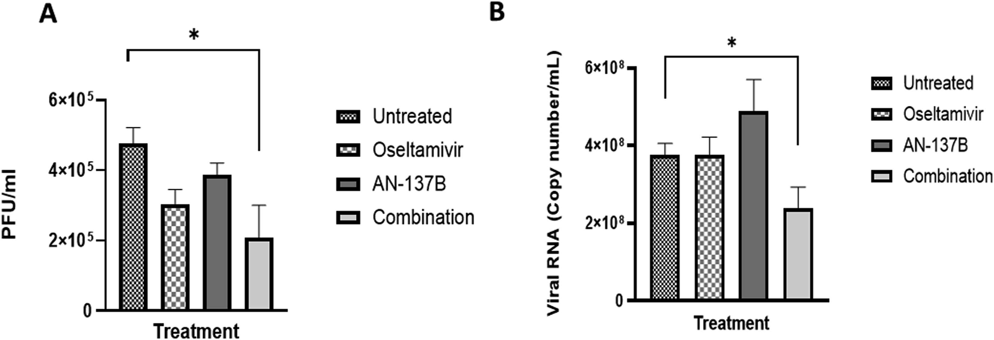 Mean LVTs determined on day 5 p.i. were comparable in the group of untreated mice and those of animals that received single oseltamivir or AN-137B treatment (4.76 ± 0.9 × 105, 3.03 ± 0.83 × 105 and 3.86 ± 0.68 × 105 PFU/mL, respectively). By contrast, the group of mice that received the combined treatment had a mean LVT of 2.53 ± 0.63 × 105, which was significantly lower than the untreated group ( Mouse lung viral titres. Mean lung viral titres ±standard deviation for 4 mice infected intranasally with 200 PFUs of influenza A/Puerto Rico/8/1934 (H1N1). Titres were determined on day 5 post-inoculation by using plaque assays in ST6-GalI-MDCK cells (a) and by quantification of vRNA by qRT-PCR (B). Data were analysed by using the one-way ANOVA test (GraphPad). *